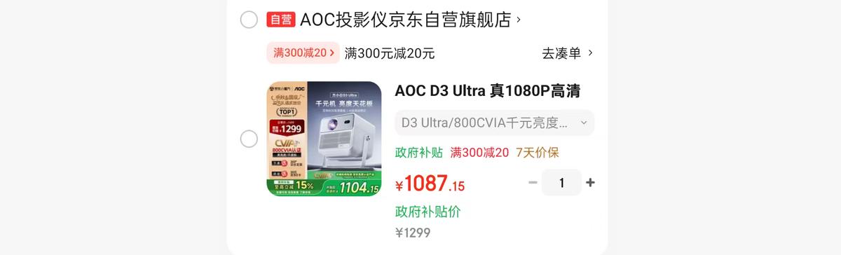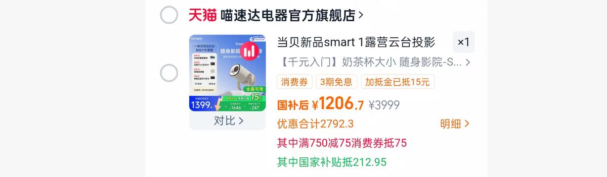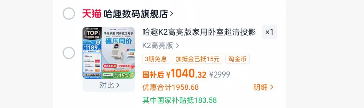 价格方面,原价1399元,某猫旗舰店目前有100元优惠券,国补至高立减15%,叠加淘金币60元,如有淘金币限时加抵还可以再减15元,最终到手1040元!性价比直接拉满,非常适合预算有限又追求观影体验的朋友在卧室使用。