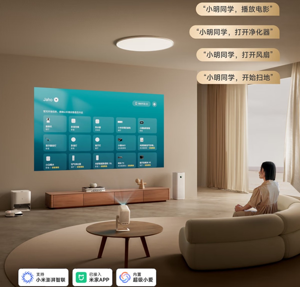 小明Q5 Pro是2024年下半年推出的新品,作为小米生态链企业产品,这款投影仪最大的亮点是接入了米家生态链,如果你家中有其他小米智能家居设备,它可以与这些设备轻松联动,实现更加智能化的家居体验 。比如,你可以通过小爱同学语音控制投影仪的开关、播放、暂停等操作,非常便捷 。