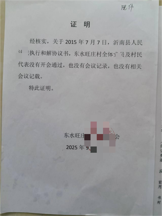 2025年9月9日,东水旺庄村村委会出具的正式《证明》,明确2015年那份《执行和解协议书》未获全体党员及村民代表开会通过,无会议记录及相关记载,并非村集体真实意思表示。