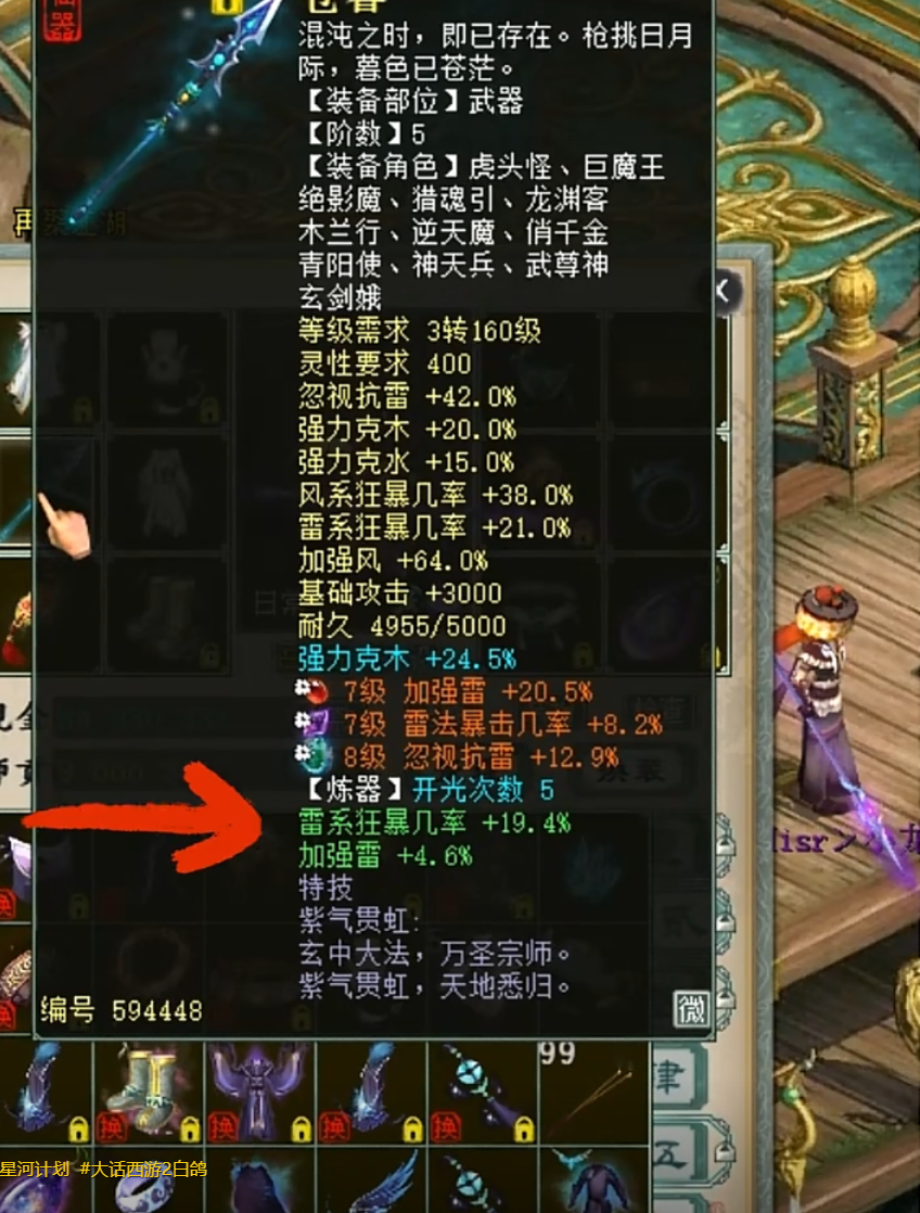 最近仙族大佬崛起了不少,看看这位老哥刚刚炼化好的5阶雷法武器。蓝字是强力克木24.5,在远古时代强雷克木炮确实比较流行,现在五开大佬还这么玩?炼器就很逆天了,雷系狂暴几率19.4,加强雷4.6,据说都是老歌自己洗出来的,这个成本和耐心真的很惊人!