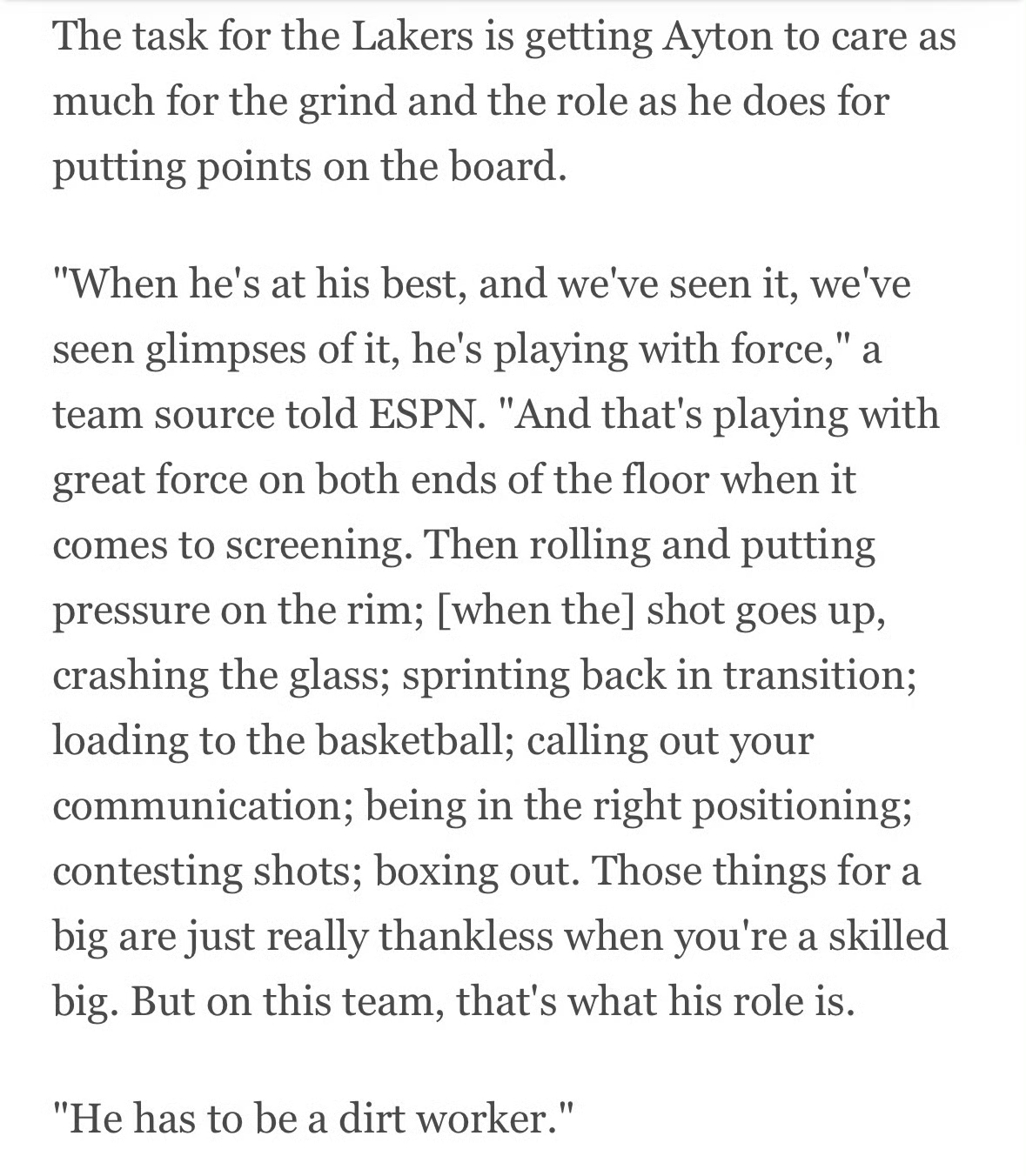 湖人现在对艾顿就一个要求:别只想着得分,得把那些不起眼的脏活累活当回事儿。一位球队内部人士说得直白:“我们都见过他最好的样子,但那往往是‘零星闪光’。 对于他这种技术型内线来说,卡位、护筐、补防这些事儿确实吃力不讨好,但在这支湖人,这就是他的角色——必须干脏活的人。 ”