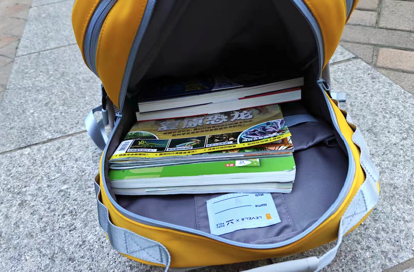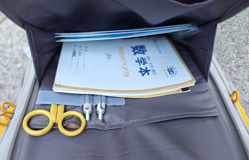 侧袋弹力很大,孩子的跳绳、水壶、雨伞都能塞的下。像我们家这种收纳整理能力特别差的男孩,在使用了这款书包之后,能够很好根据书包原有的区域设置来放置自己的东西。