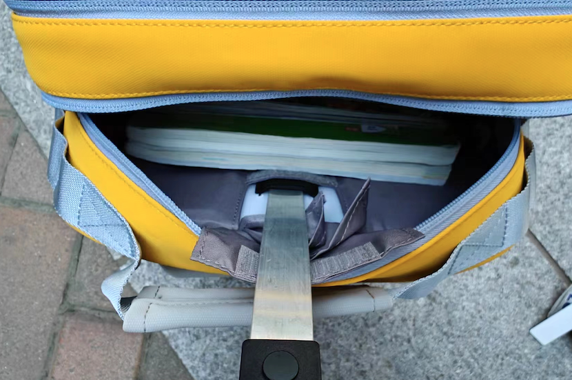在背包的内部背面还隐藏了一根类似脊骨形状的铝合金支撑,这样能够一定程度上代替孩子后背起到支撑的作用,分散肩部的重量,使得背部得到伸展,背包的同时站立行走都能直起腰来。相比于普通的仅仅通过背部设计来实现护脊效果的书包,我认为这种真材实料的植入龙骨设计效果更明显一些。
