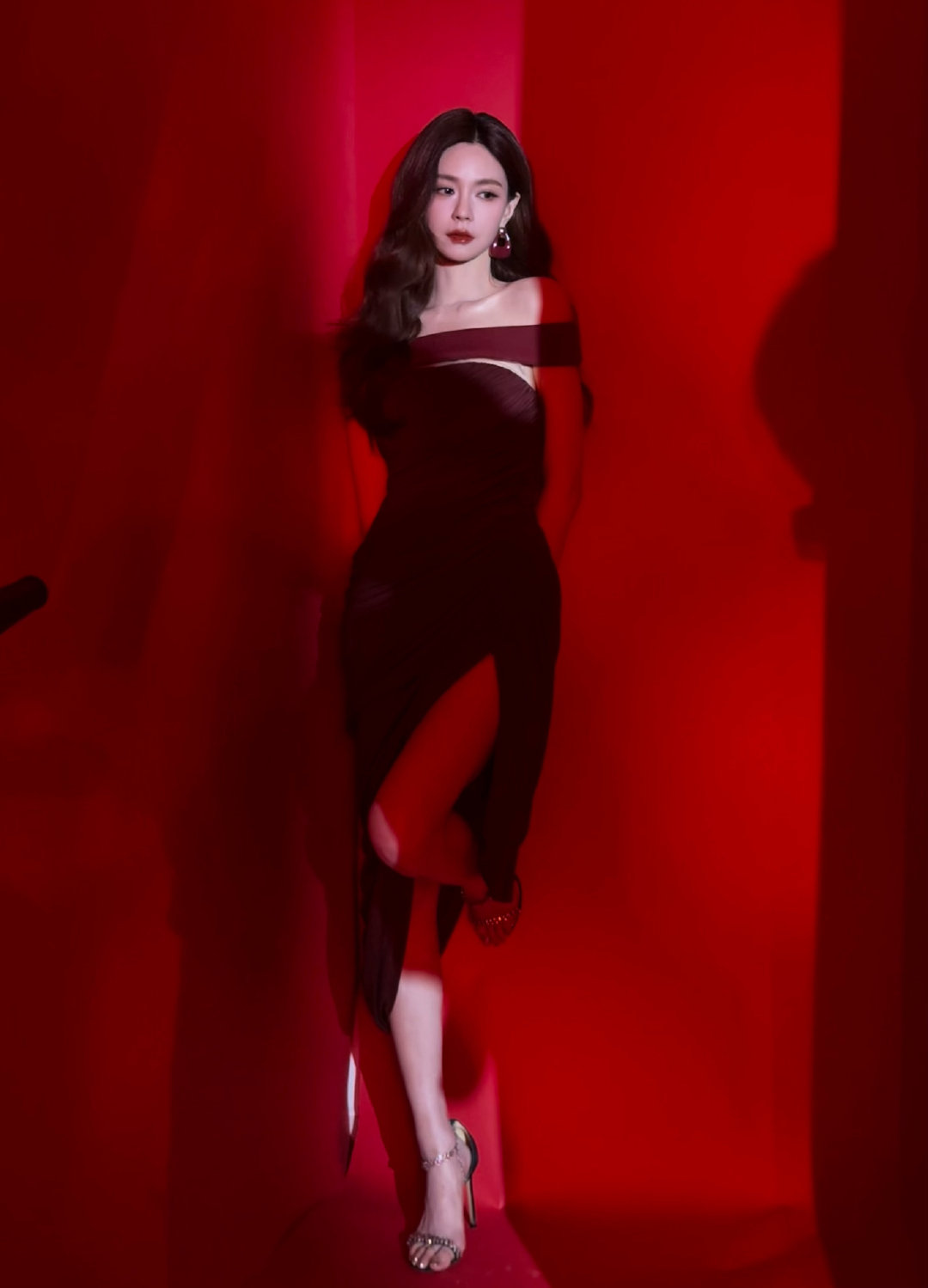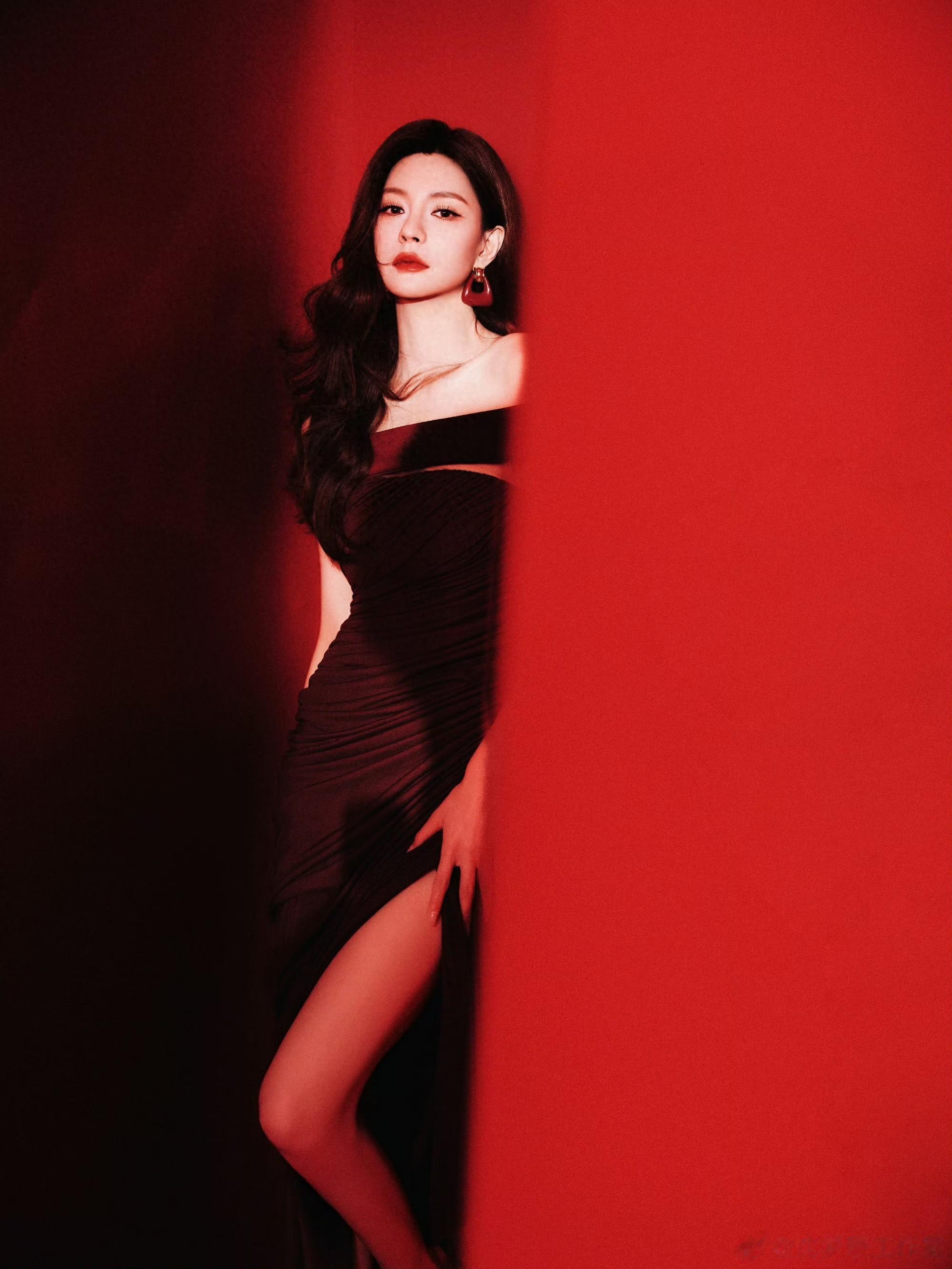 沈梦辰红裙抹胸连衣裙,大长腿美女