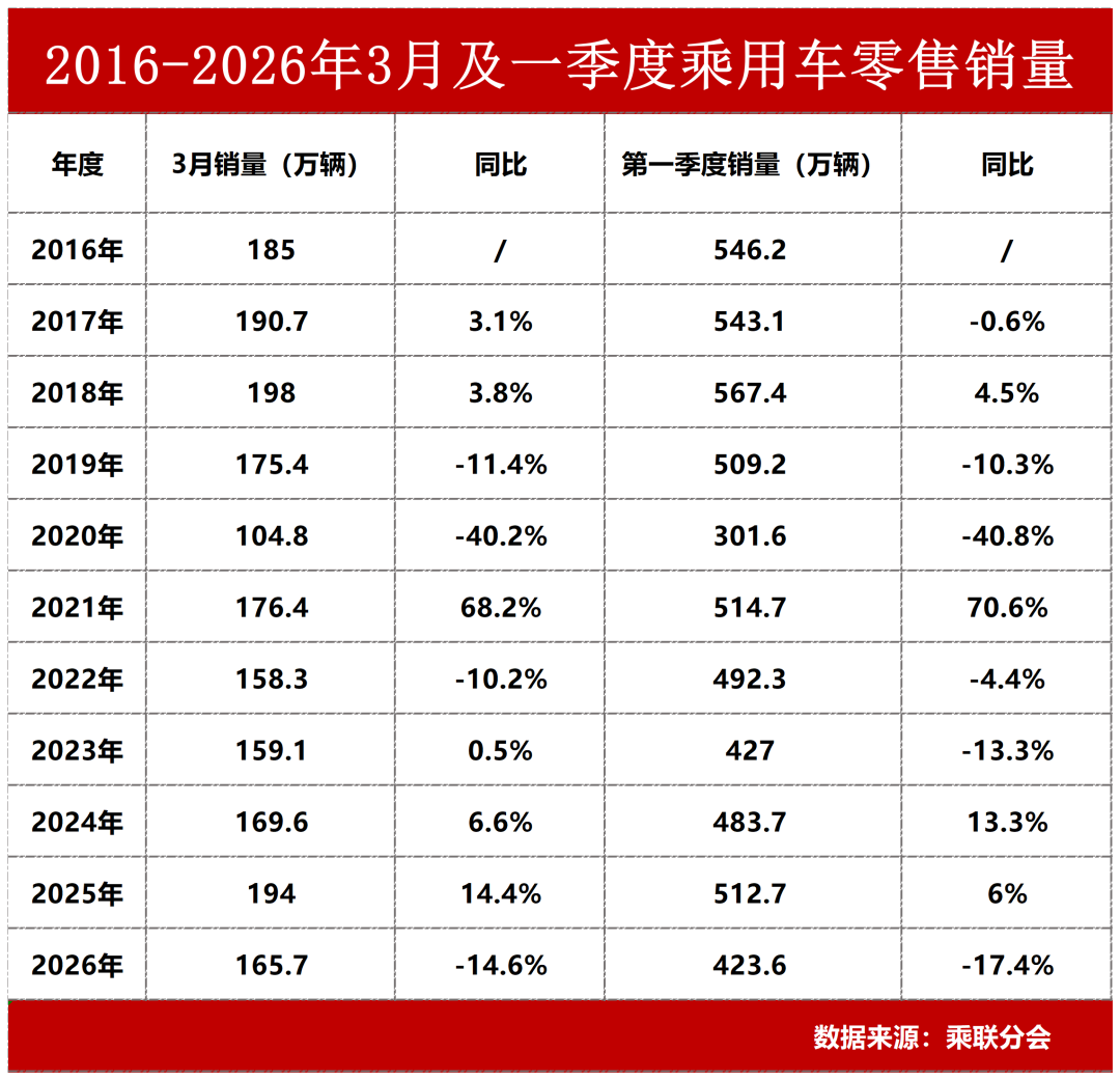 2026年的开端,中国车市没有等来往年的“小阳春”。乘联分会数据显示,今年一季度全国乘用车市场累计零售423.6万辆,同比下跌17%。这是除2020年疫情影响外,近10年来最惨淡的季度成绩单。新能源车更是遭遇“倒春寒”——一季度累计零售184.4万辆,同比大跌24%,渗透率从去年四季度的高点回落至47.3%,车辆购置税减免政策在2025年底正式退出后,消费者的提前透支效应远比预期猛烈。