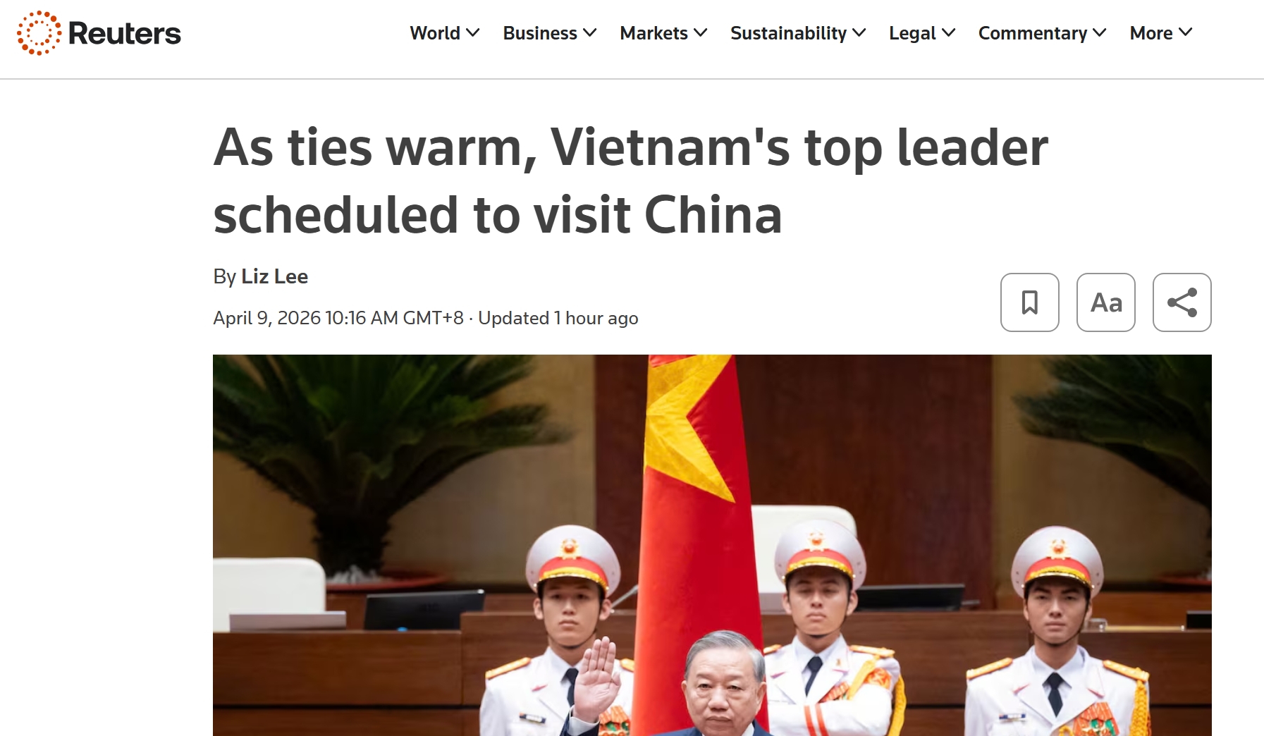 据新华社4月9日的消息,越共中央总书记,刚刚当选越南国家主席的苏林及其夫人预计将在4月14日至17日之间访问中国。