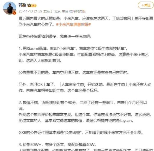 相关汽车博主@韩路表示称,小米汽车的首款车型起步价可能会超过30万,高配版更是奔着40万去了,这对于很多期盼小米汽车定价十几万的米粉们来说,可能是要失望了。但我们从产品上来看,小米汽车很明显就是一台定位C级的旗舰级轿跑车,想要它定价十几万,显然是不太现实的,所以还不如关注一下小米汽车究竟能不能支撑起这超30万的价格。