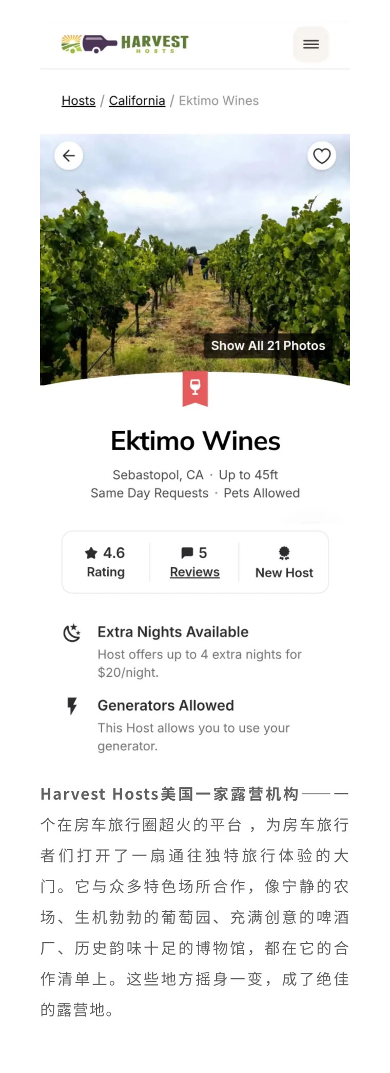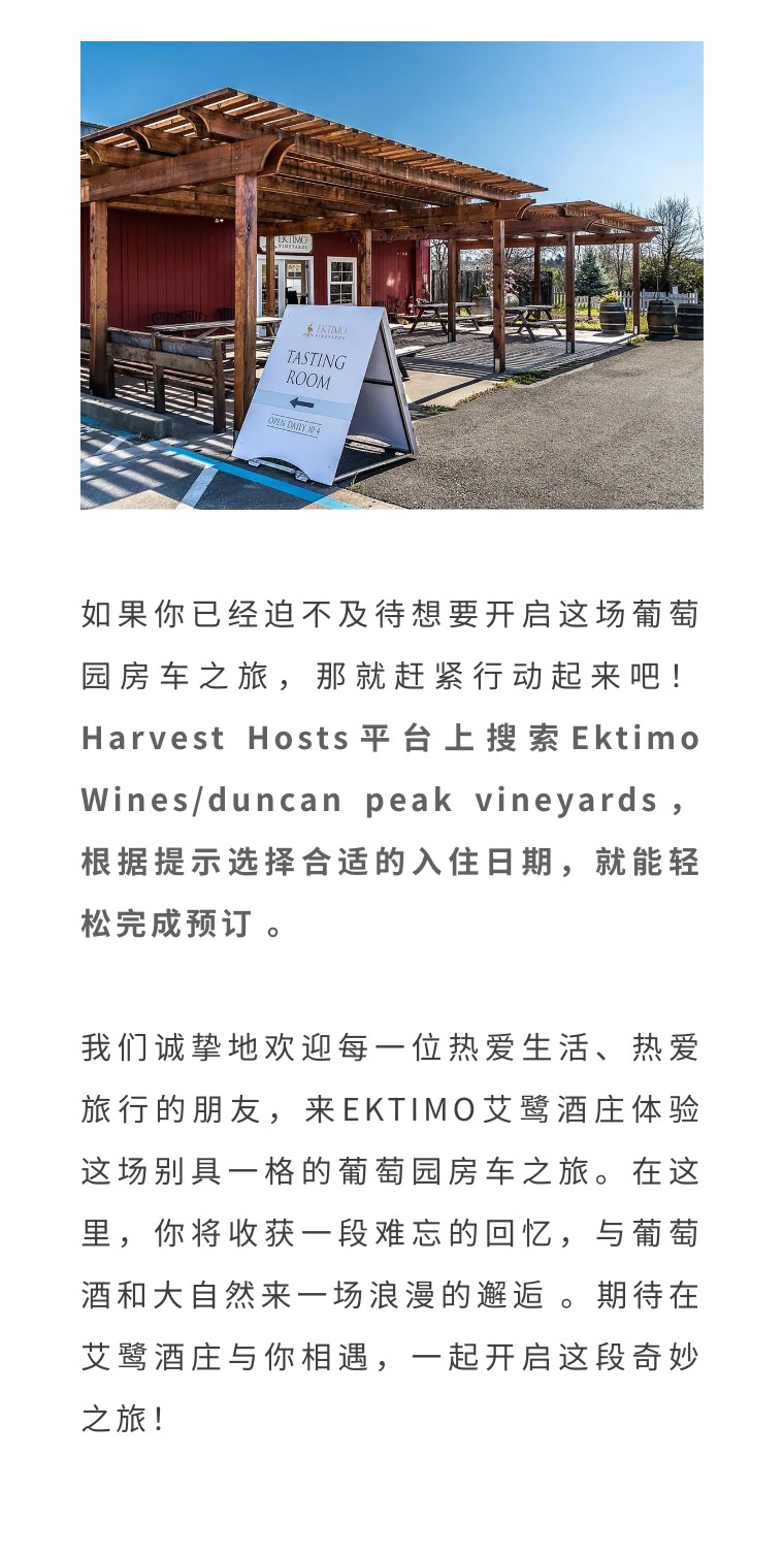 亲爱的葡萄酒爱好者和房车旅行达人们,EKTIMO艾鹭酒庄要宣布一个超棒的消息!我们正式入驻了 Harvest Hosts
