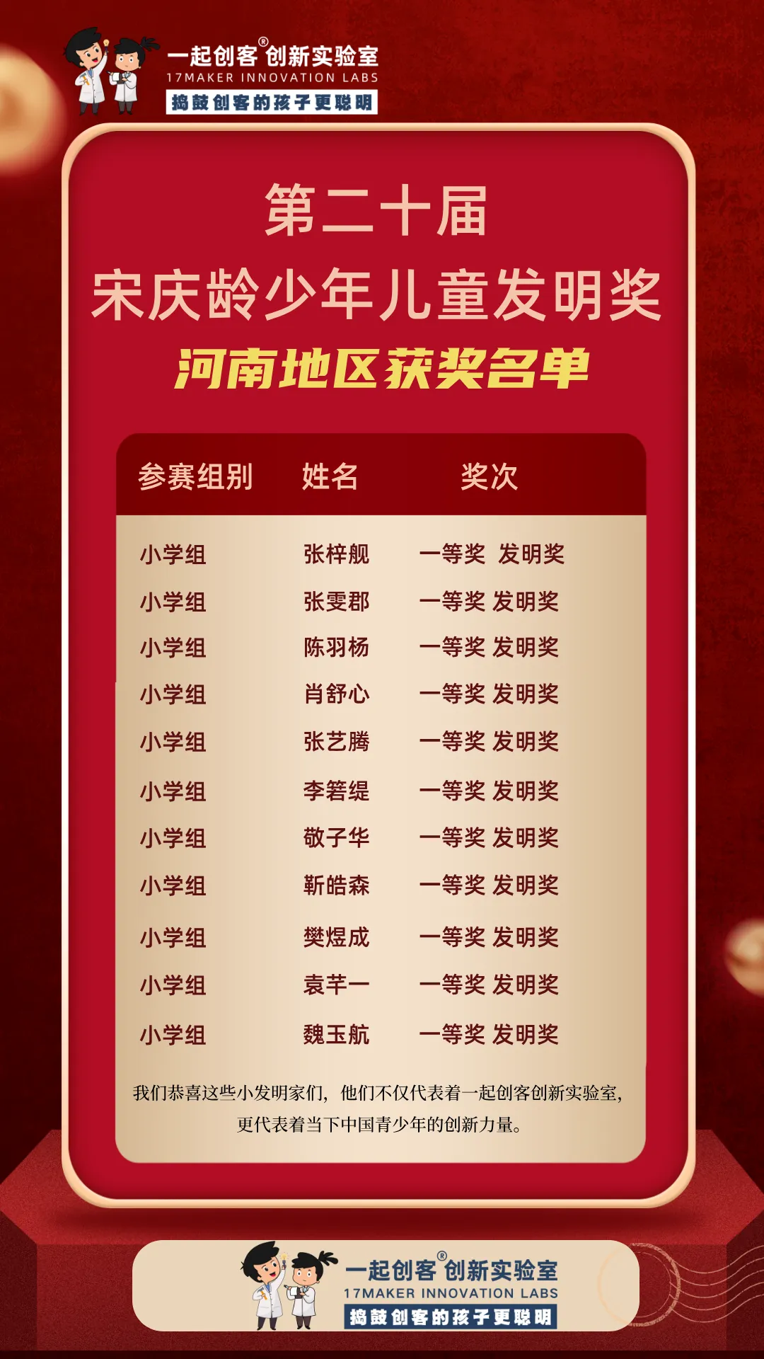 近日,第二十届宋庆龄少年儿童发明奖获奖名单揭晓,一起创客创新实验室17maker LAB的小创客们在此项国家级青少年科技竞赛中表现突出,斩获全国铜奖3项、河南省一等奖15项、河南省二等奖6项。