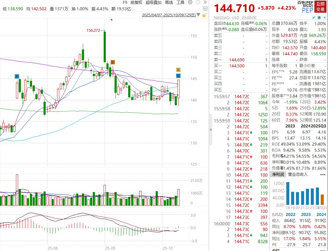 财报显示,百事公司第三季度净营收达到239.4亿美元,高于分析师平均预期的238.3亿美元。调整后每股收益同样表现亮眼,比预期高出3美分。本季度的增长主要得益于国际市场的稳健表现(占总收入的约40%)以及美国本土健康饮料品类的强劲销售势头。