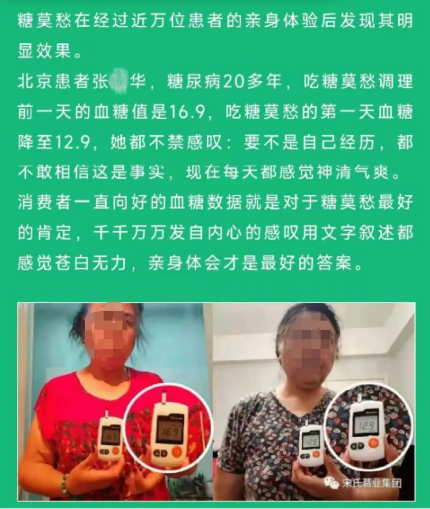 在广告中,“糖莫愁”使用了一些患者的名义来为产品做宣传。然而,这些言论的真实性和合规性并未得到证实。使用患者和专家的名义进行宣传,必须确保这些言论的真实性和合规性,否则可能构成虚假宣传或误导消费者。