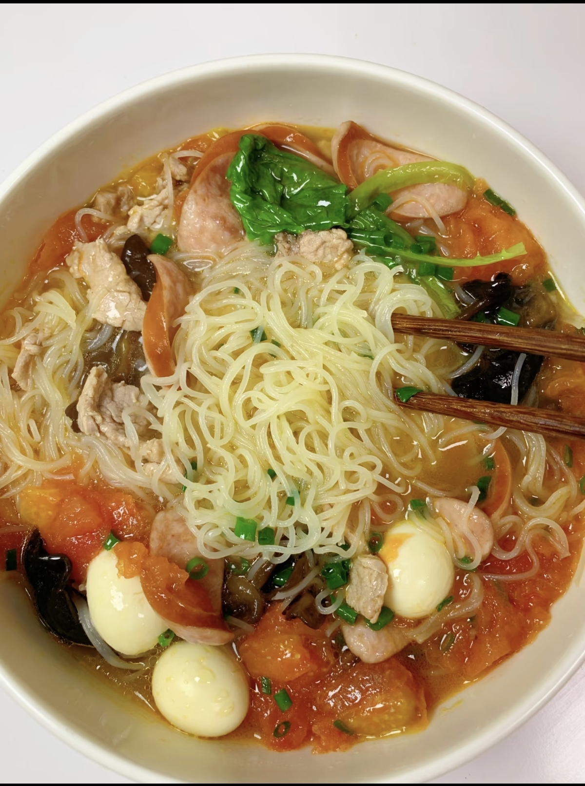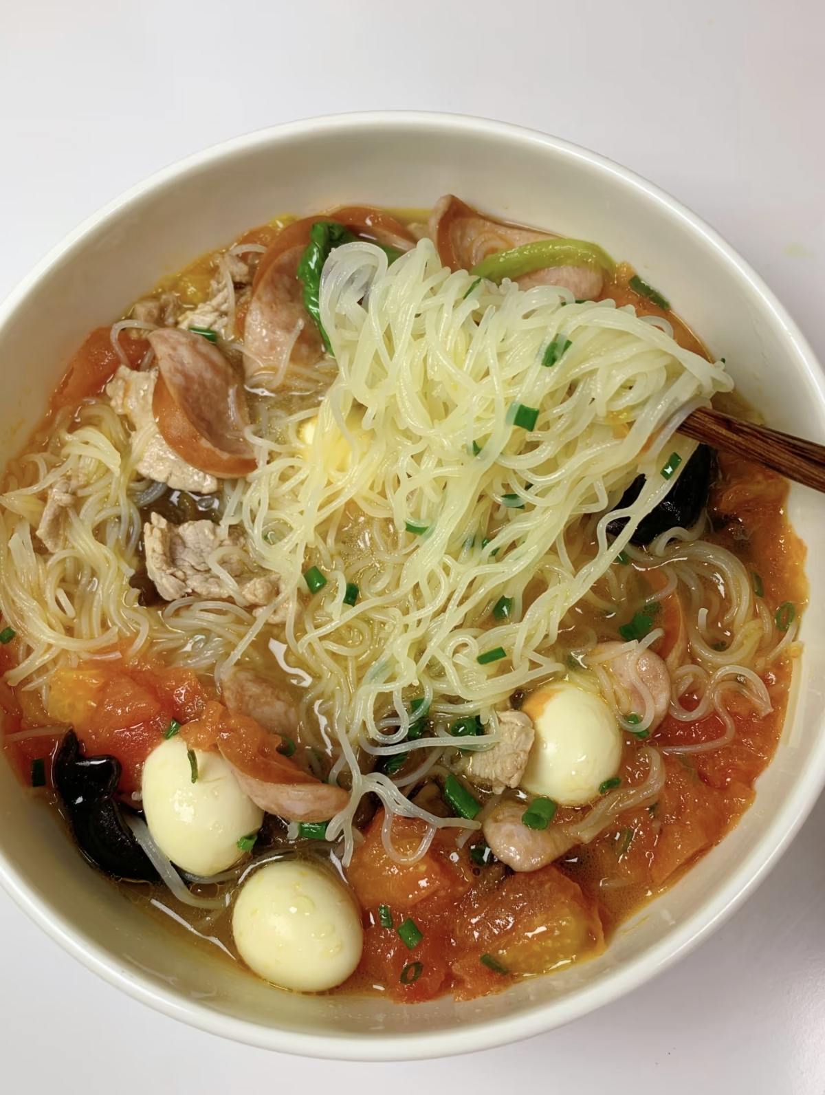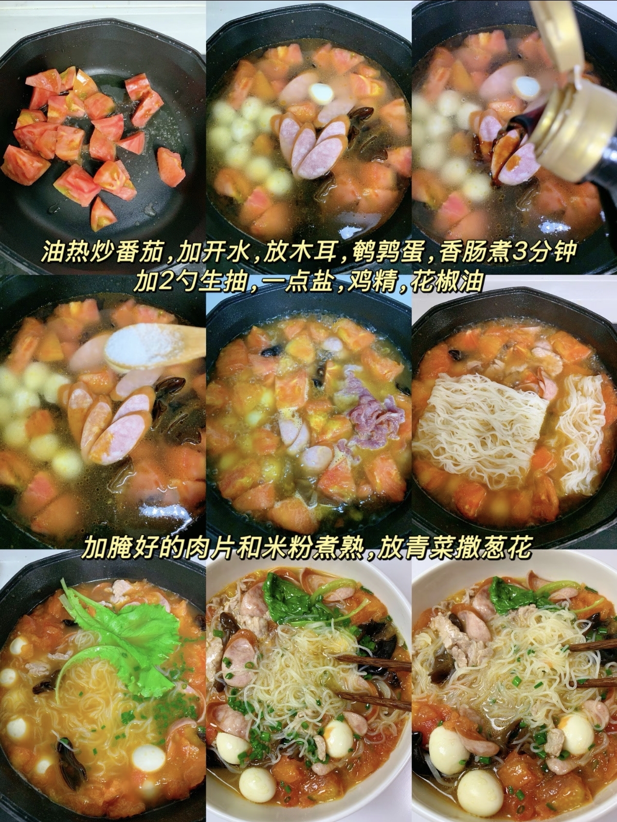 时间到后,汤底已呈现出诱人的金黄色,香气四溢。此时,加入少许盐和白胡椒粉调味,再将腌制好的肉片一片片滑入汤中,待其变色煮熟。最后,放入事先煮好的米粉,让它们在鲜美的汤汁中尽情“沐浴”,吸饱汤汁的精华。关火,撒上一把翠绿的葱花,滴上几滴香油,一碗色香味俱全的三鲜米粉便大功告成。米粉的爽滑、肉片的嫩薄、菌菇的韧劲与番茄汤底的酸甜鲜美,在口中交织融合,每一口都是满满的幸福感。