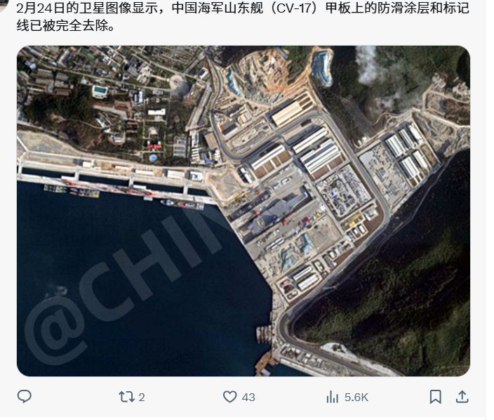最近中国海军山东舰,传来了一个值得关注的消息。最新卫星图像显示,山东舰正在海南三亚干船坞进行陆地维护。它的甲板上,防滑涂层和所有标记线,已经被完全去除。按照计划,后续工作人员会重新画线,外界纷纷猜测,这一举动,很有可能是为歼-35隐身舰载机上舰做准备。