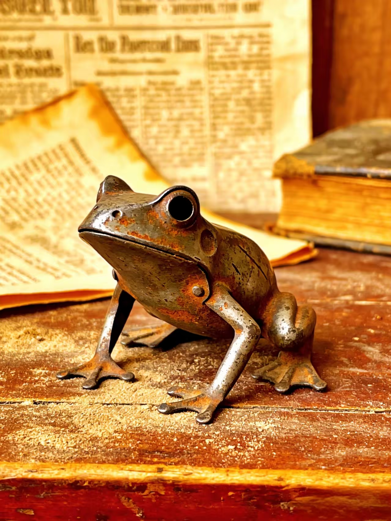 今天整理老家的储物间,在一个落满灰的旧木箱子里,翻出了个用报纸包得严严实实的东西。拆开一看,是我小时候的铁皮青蛙。