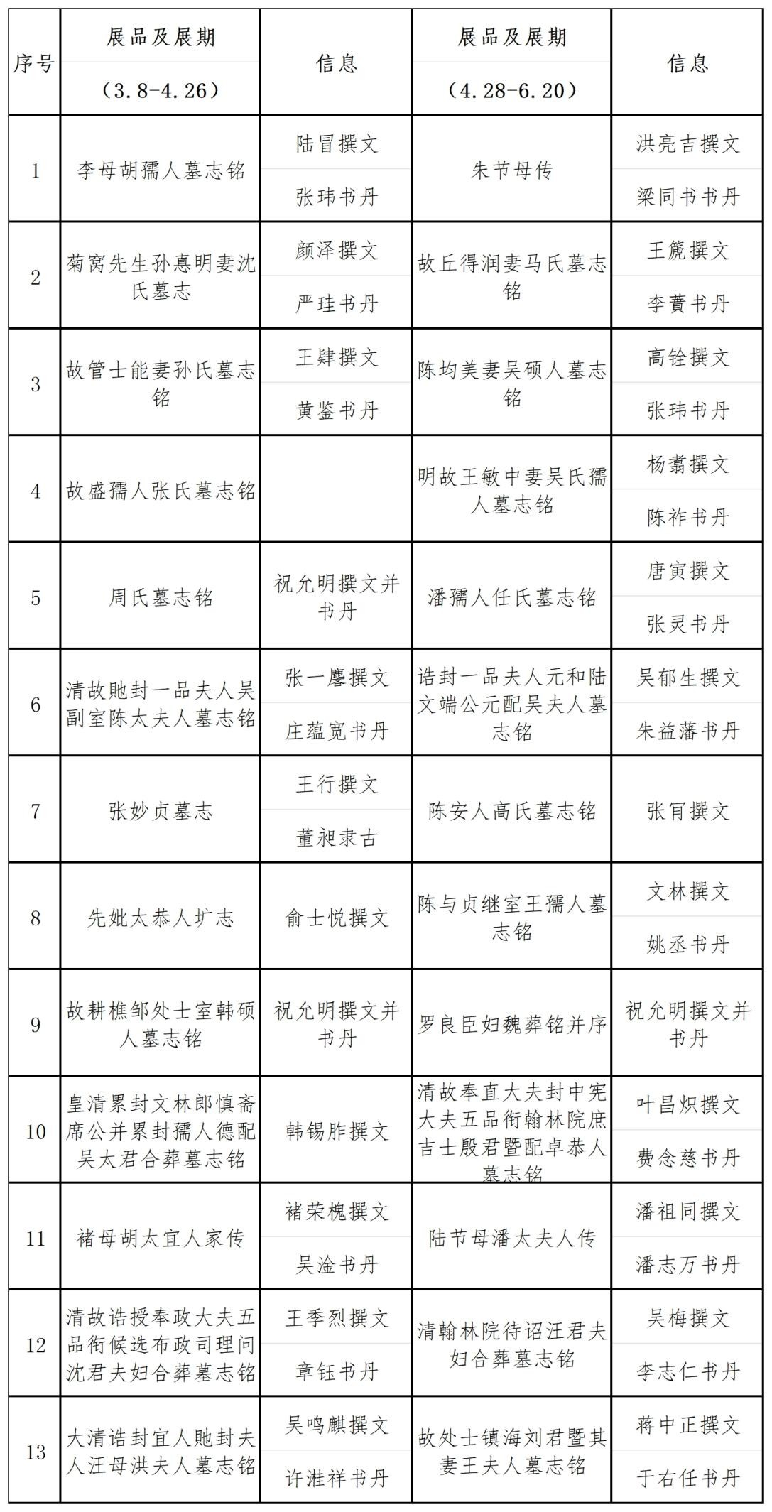 本次展览试图从多重维度对女性墓志铭展开解读:一瞻苏州古代女性个体的品德与行迹,二察世家大族中女性的角色与境遇,三品文人名士所撰女性墓志铭的文辞书法,四探女子教育之发展。