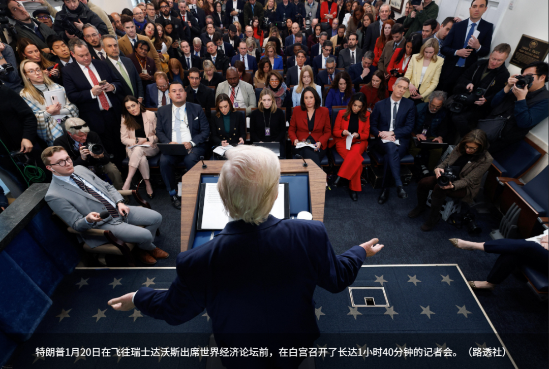 综合《纽约时报》和路透社报道,特朗普星期二(1月20日)在飞往瑞士达沃斯出席世界经济论坛前,在白宫召开了长达1小时40分钟的记者会。
