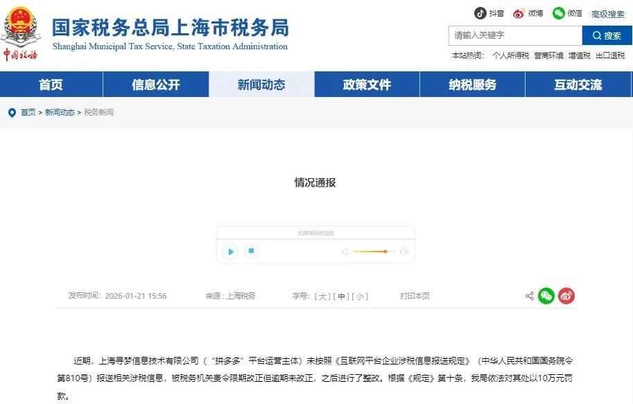 财新网2026年1月21日报道,因未按照《互联网平台企业涉税信息报送规定》的要求报送涉税信息,上海市长宁区税务局对拼多多作出罚款10万元的处罚决定。上海寻梦信息技术有限公司("拼多多"平台运营主体)未报送2025年第三季度平台内经营者和从业人员涉税信息,2025年11月税务机关依法对其作出责令限期改正通知,但其未在规定期限内改正。税务机关依法依规处以10万元罚款。