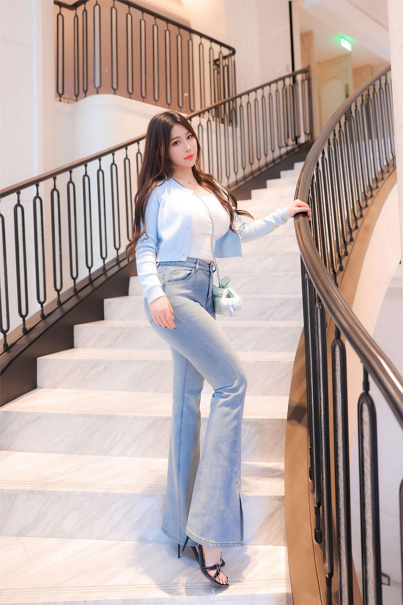 一位年轻女性站在楼梯扶手边,黑发披肩,妆容淡雅。她身穿浅蓝色短开衫与牛仔裤,斜挎绿色小包,姿态自然大方。背景中石柱与模糊
