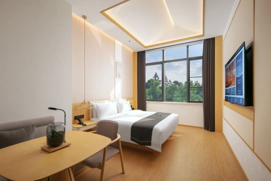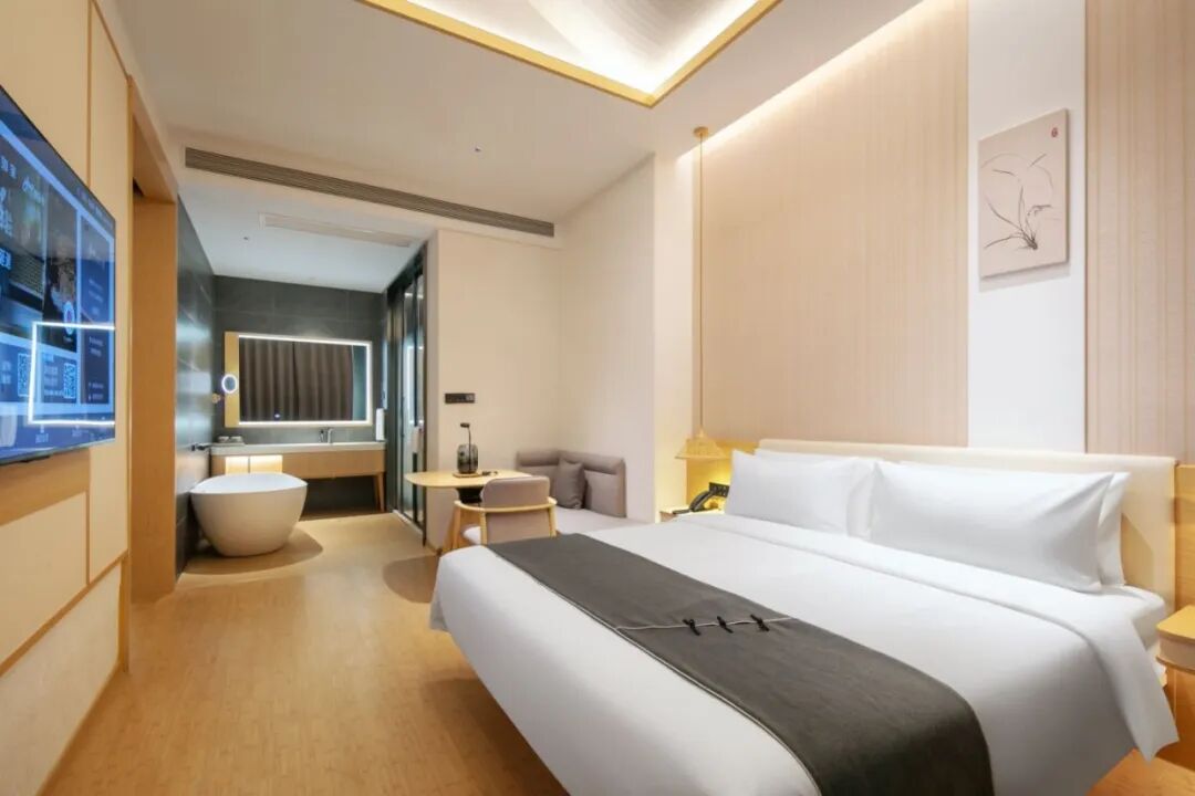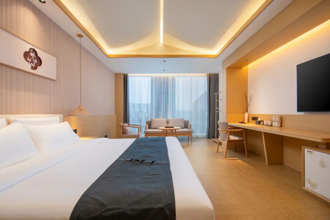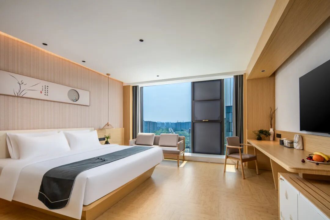 酒店建造以自然环保材料为主,主色温润如玉,配置实用节能;风格简约竹编制品、随处可见的菩提叶元素、极富文化感的客房书卷顶,处处透露出东方美学的含蓄与雅致。这一切共同营造出一个舒适、安逸、解压的“城市隐逸空间”。