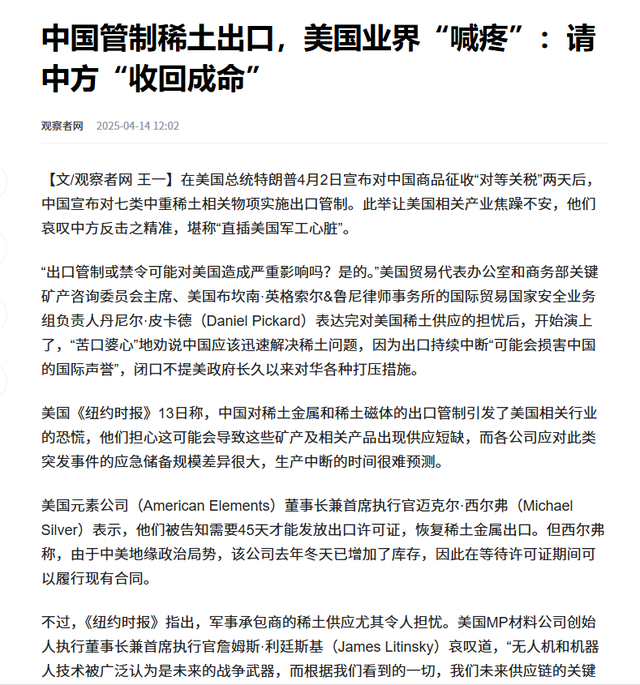 “被中国震惊15年了,美国还是没搞定稀土”.观察者网.2025-04-17中国管制稀土出口,美国业界“喊疼”:请中方“收回成命”.观察者网.2025-04-14