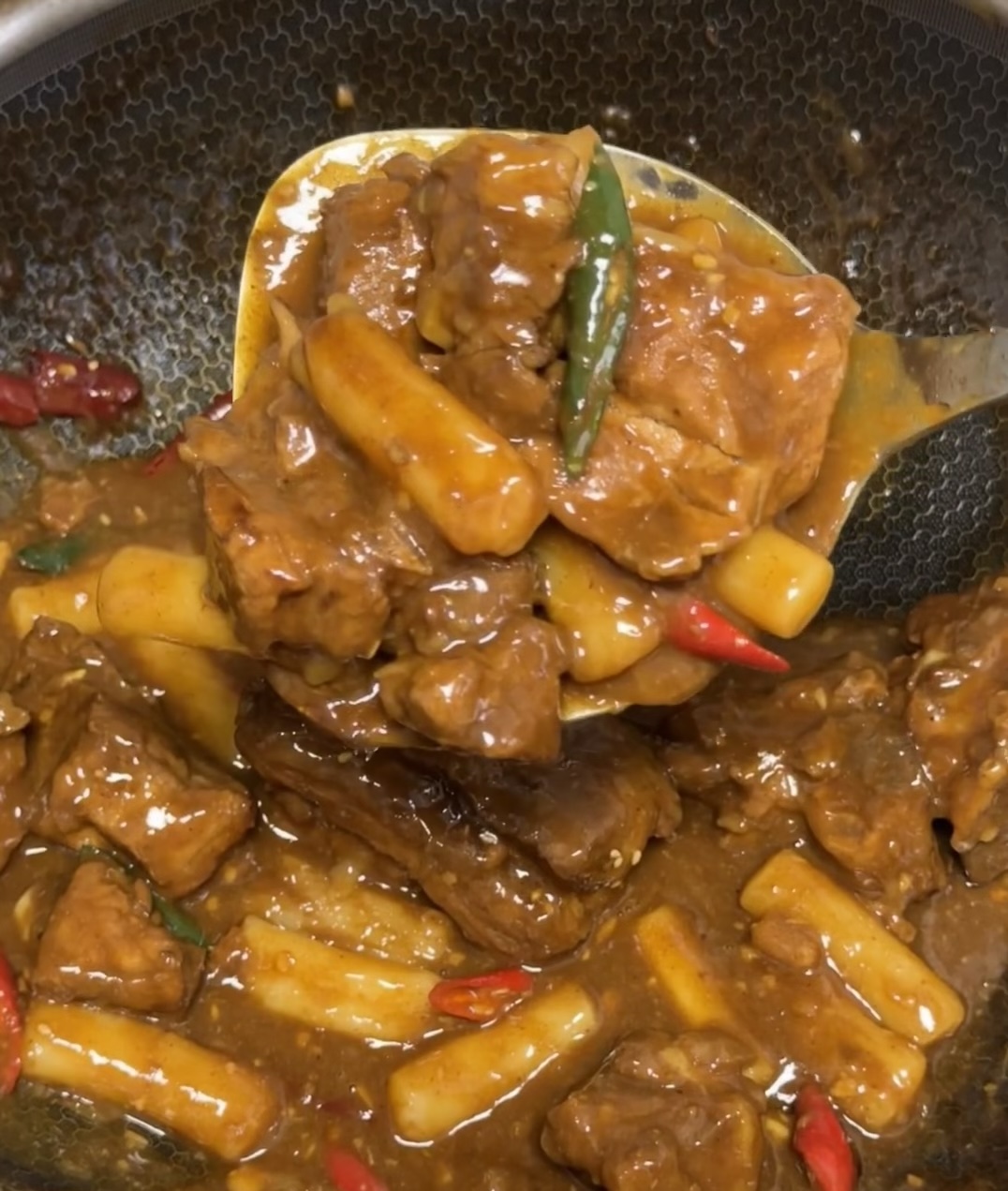 4.煮好的辣咖喱排骨年糕,搭配米饭食用更佳,浓稠的咖喱酱汁拌着米饭,香气十足。