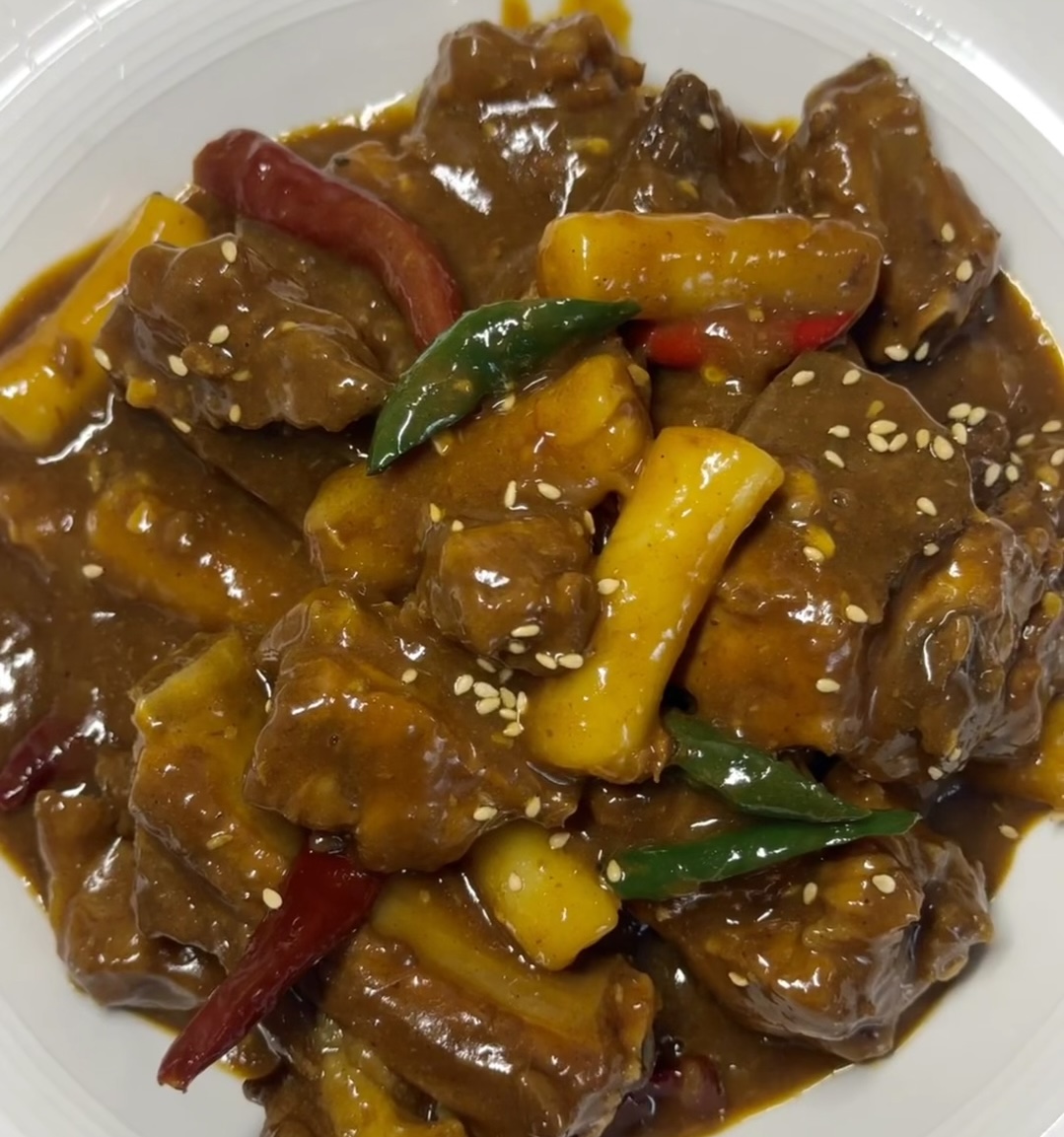 5.调味出锅:根据个人口味加入少许盐调味(咖喱块本身有咸味,盐需少量添加),翻炒均匀后即可关火。将辣咖喱排骨年糕盛出,可撒少许葱花或香菜点缀,提升颜值和风味。