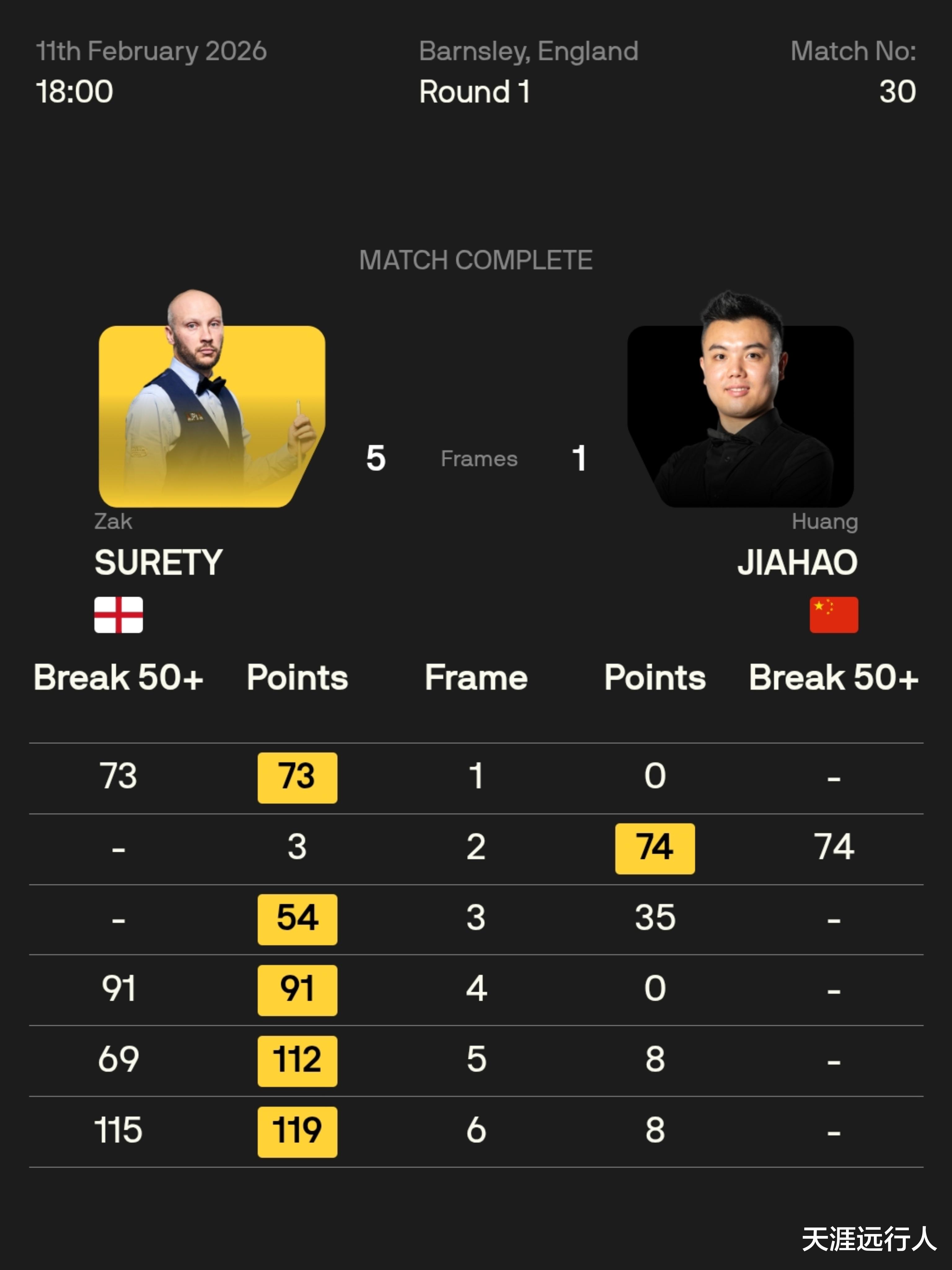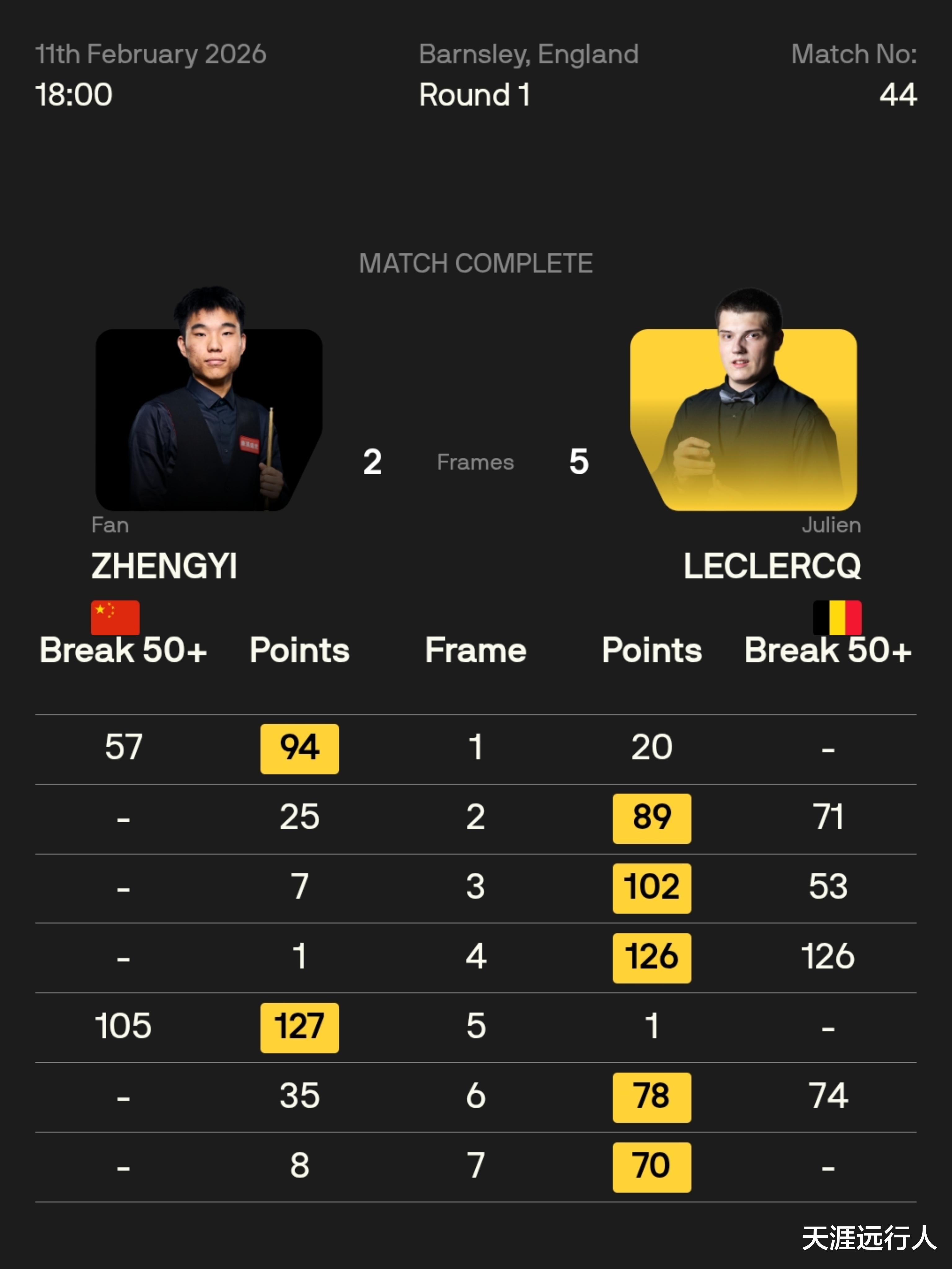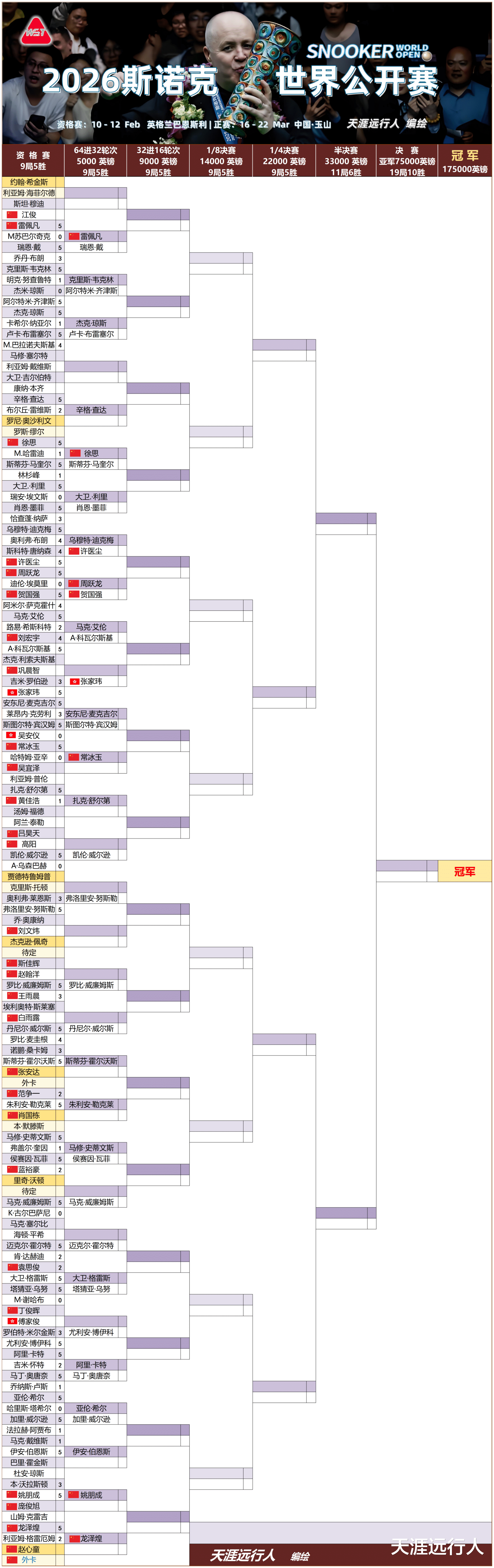 北京时间2月12日凌晨6时40分,2026斯诺克世界公开赛资格赛阶段第二比赛日,128进64轮次的21场角逐,全部分出了高下,正赛64强已经产生42席。