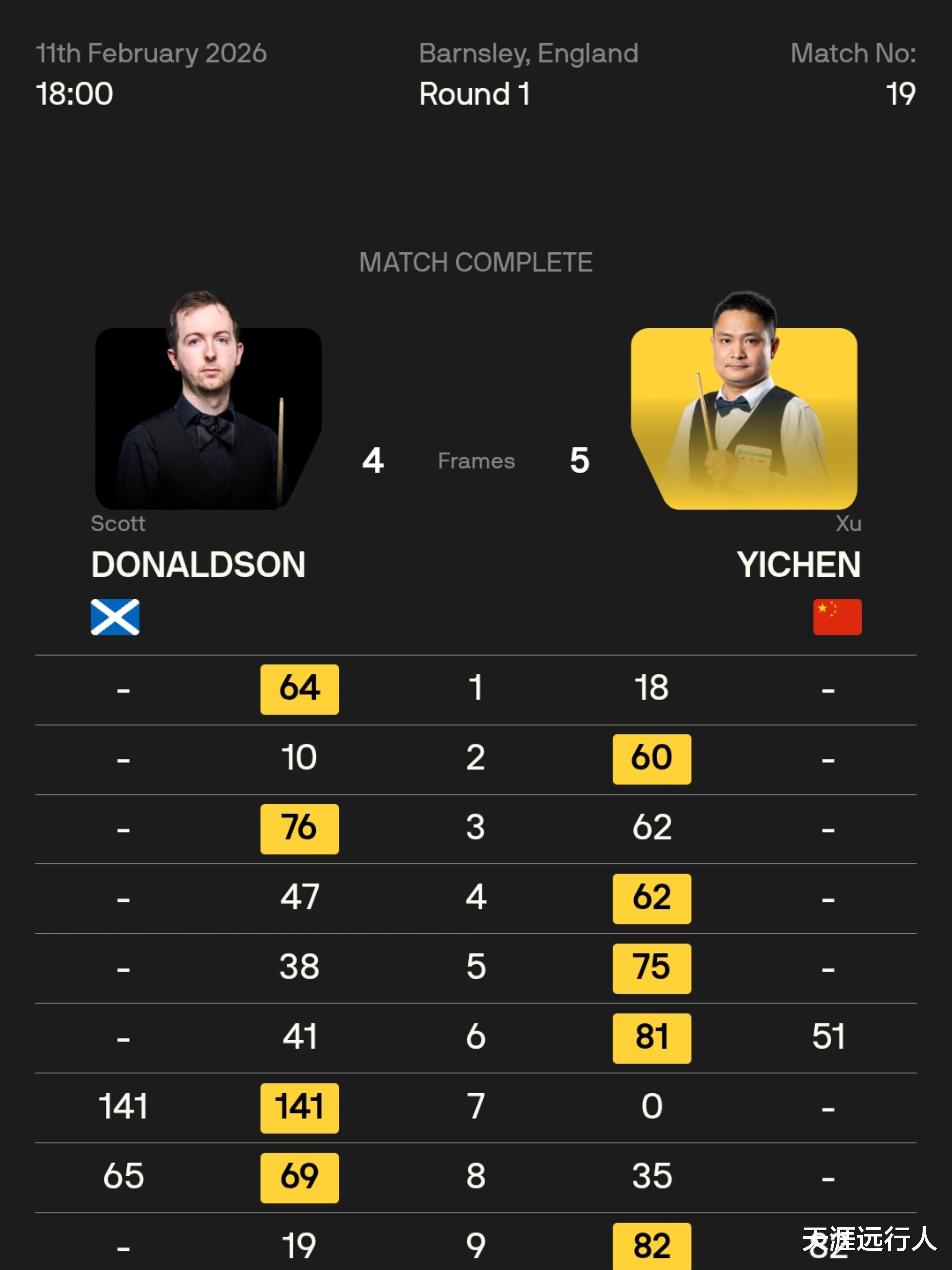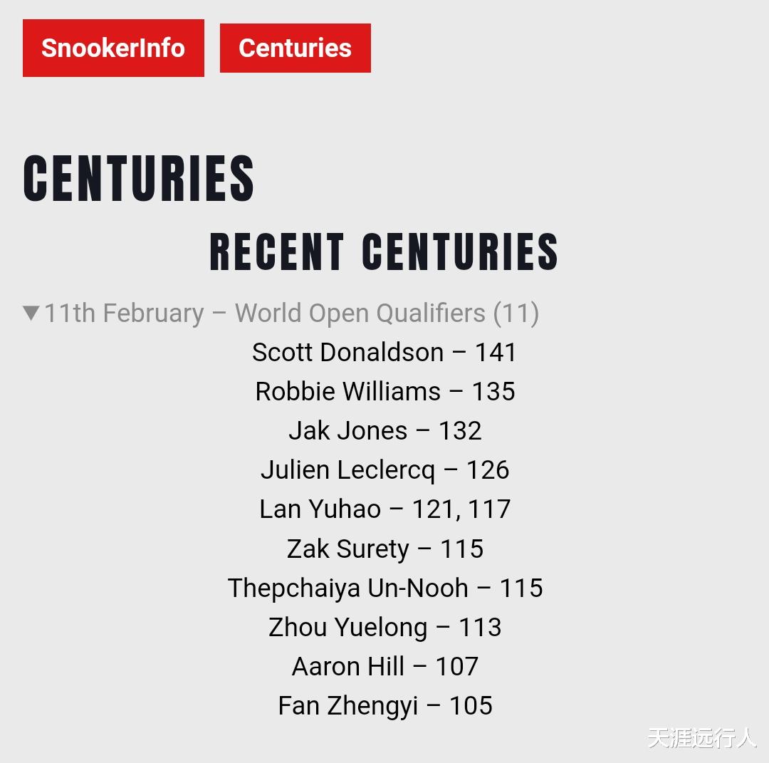 这个比赛日,共打出11杆单杆过百,中国球员打出四杆,其中本轮止步的小将蓝裕豪打了两杆,范争一打了一杆,另外被许医尘绝杀的丁克星唐纳森轰出141分、本届赛会截止目前的单杆最高分。