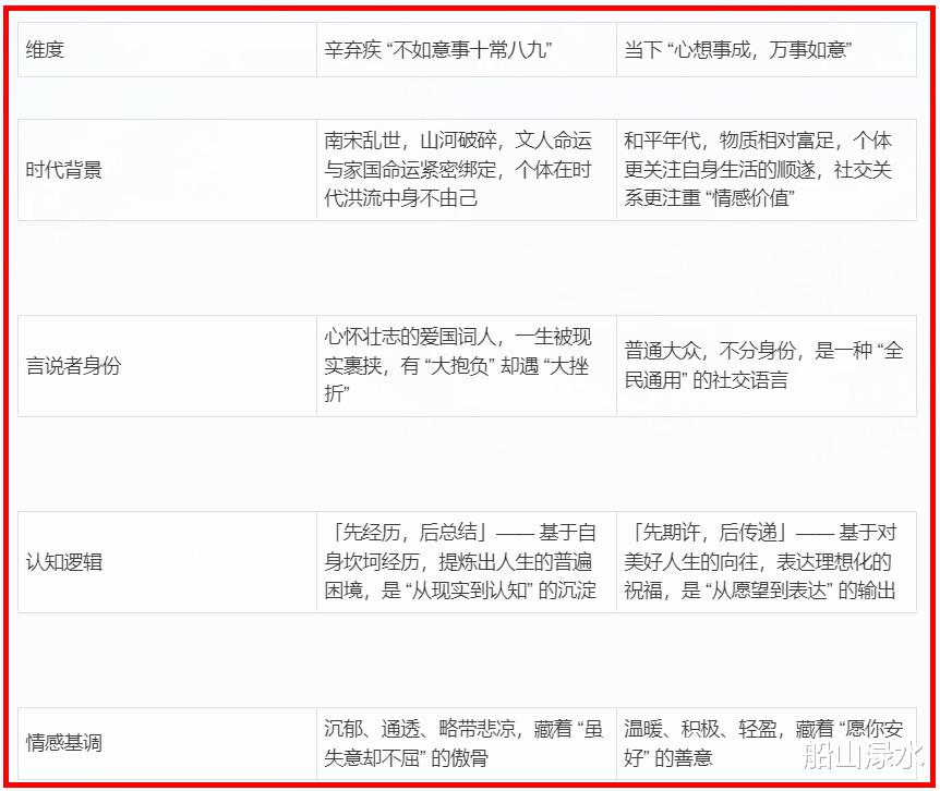 辛弃疾“叹人生、不如意事,十常八九”与当下“心想事成,万事如意”的对比,核心是**人生认知的“实然”与“应然”之分**——前者是历经世事沧桑后的清醒慨叹,后者是人际交往中传递善意的美好期许,二者语境的差异,根植于时代背景、言说目的与人生心境的截然不同,具体可从以下维度剖析:
