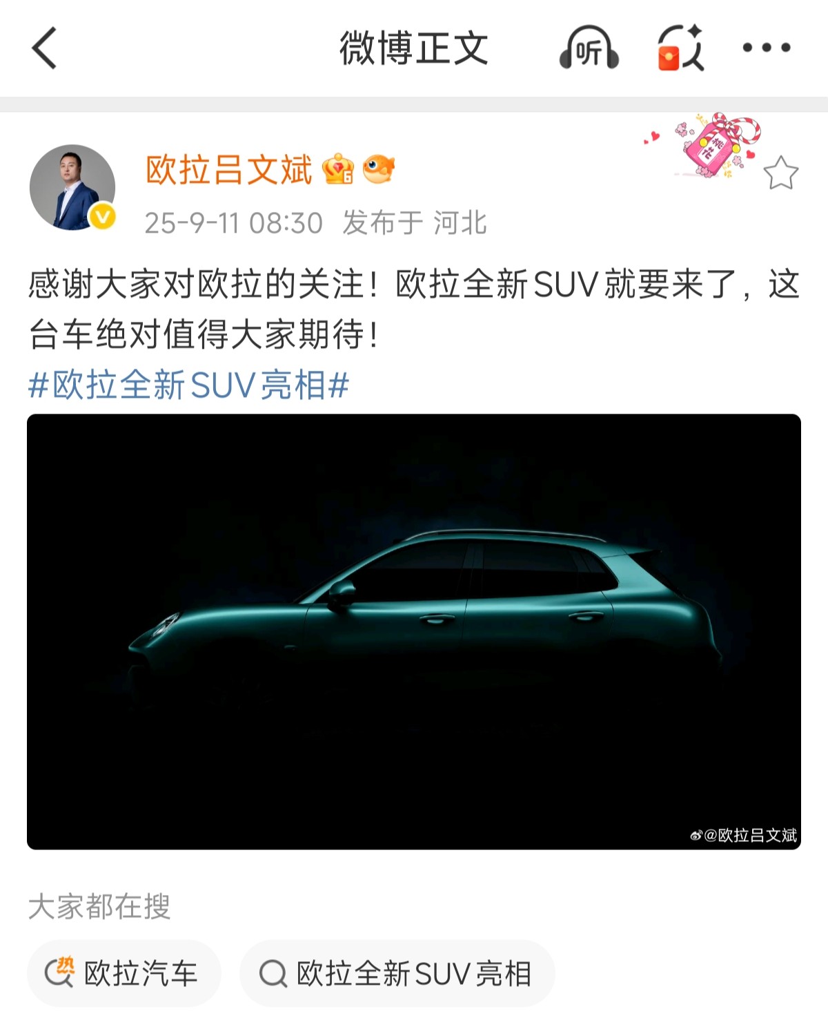 随后,欧拉品牌总经理吕文斌利用其社交账号发布了两张欧拉全新SUV的侧面线条图,并配文“感谢大家对欧拉的关注!欧拉全新SUV就要来了,这台车绝对值得大家期待!”