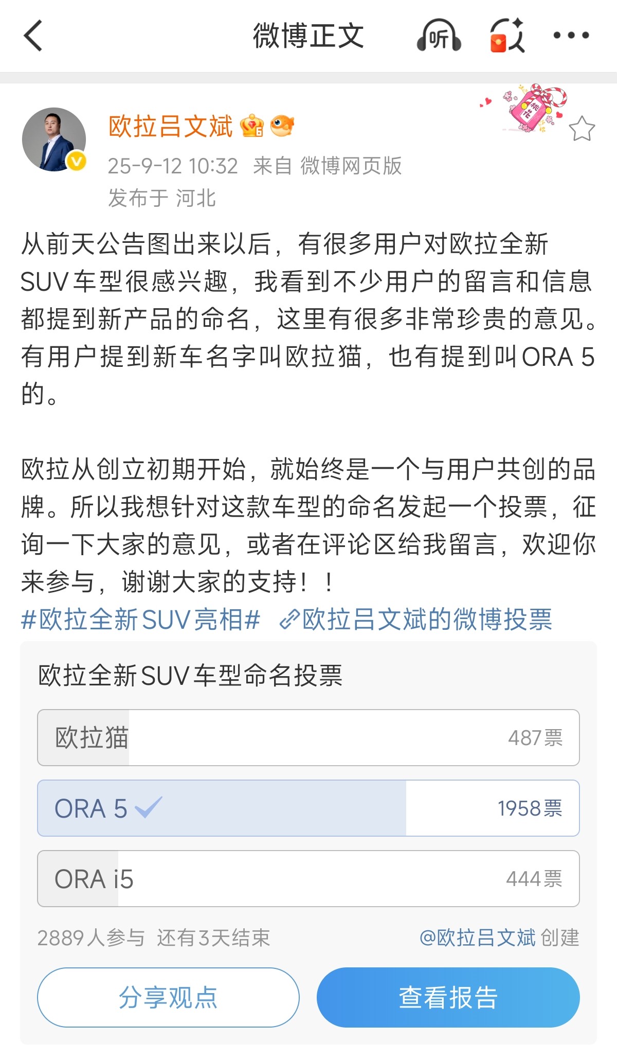 不过很快,欧拉品牌总经理吕文斌就表示经过用户投票,目前ORA 5的命名是绝对领先的,并期待大家持续投票产生最终定名!