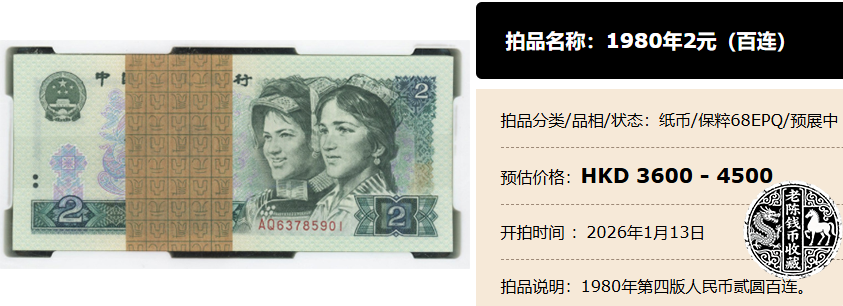在1月13号的时候,一整刀百连的1980年2元才真正开拍,现在预展中的评估价格,竟然达到了4500港币。