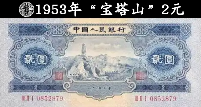 1953年2元因为主体图案是宝塔山,所以在收藏圈子里面,被称为“宝塔山”2元,属于二版纸币里面的一个面值。