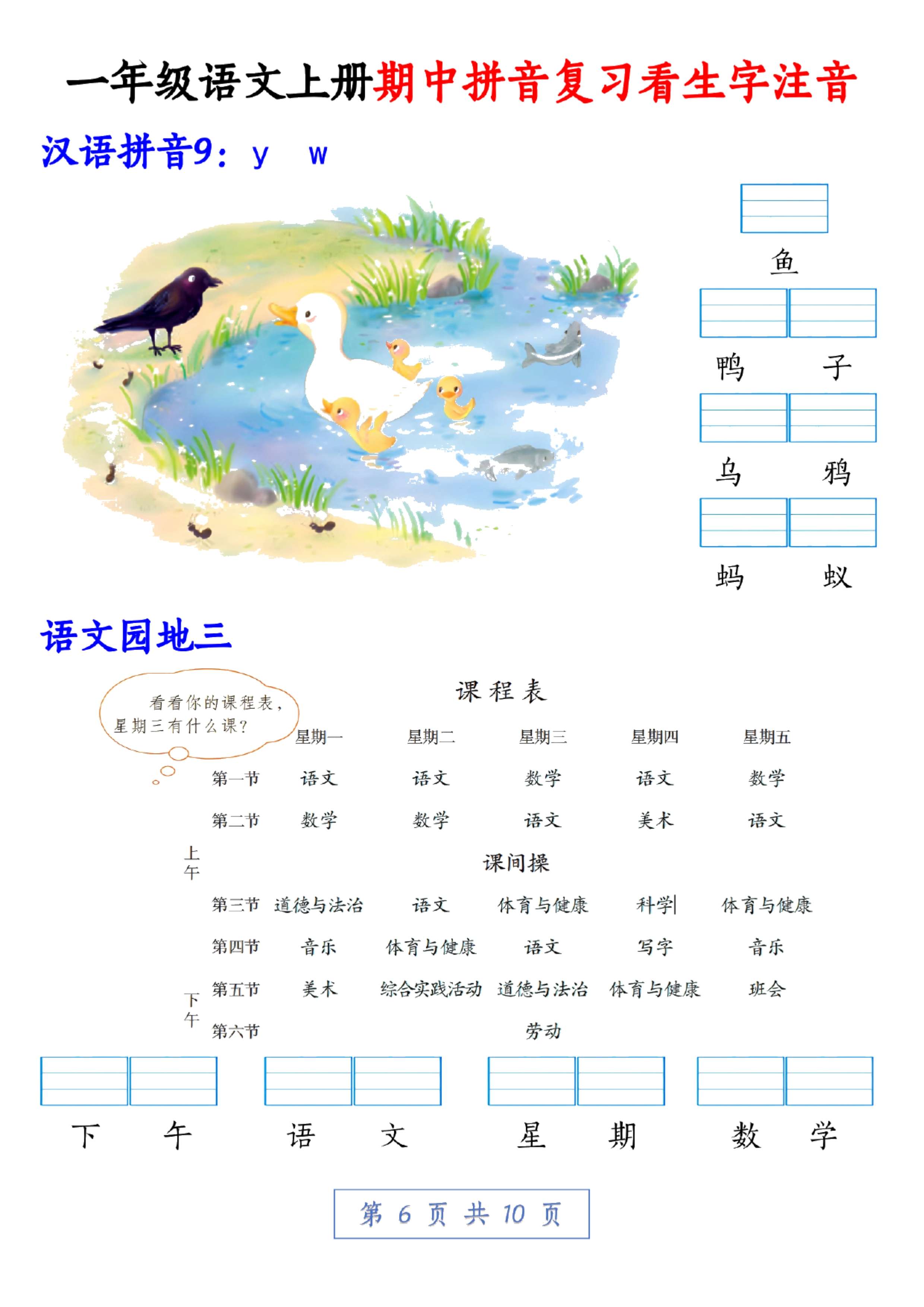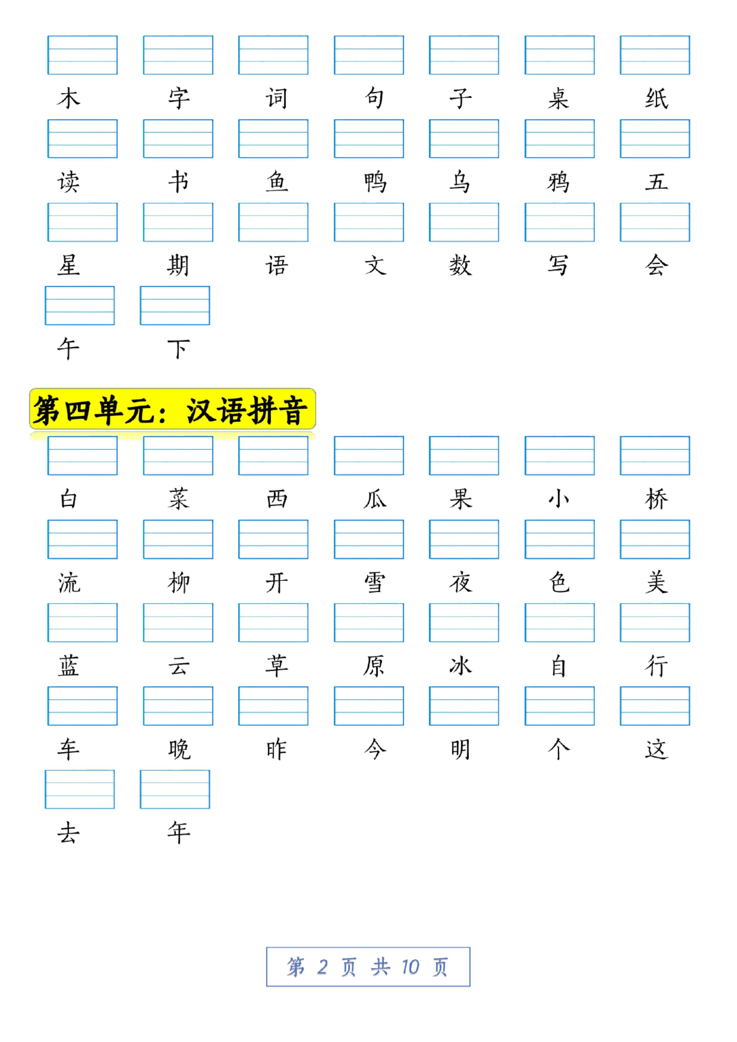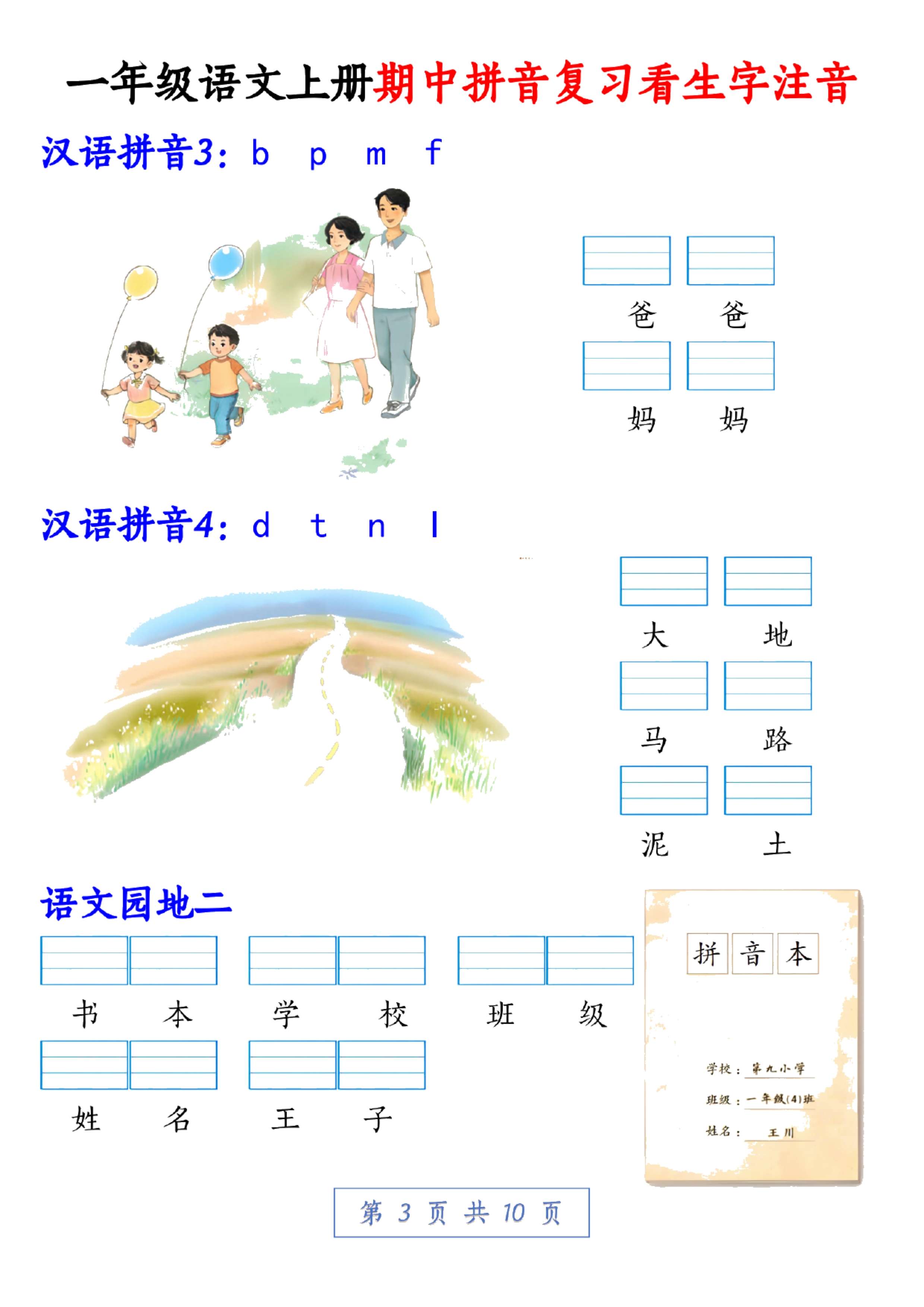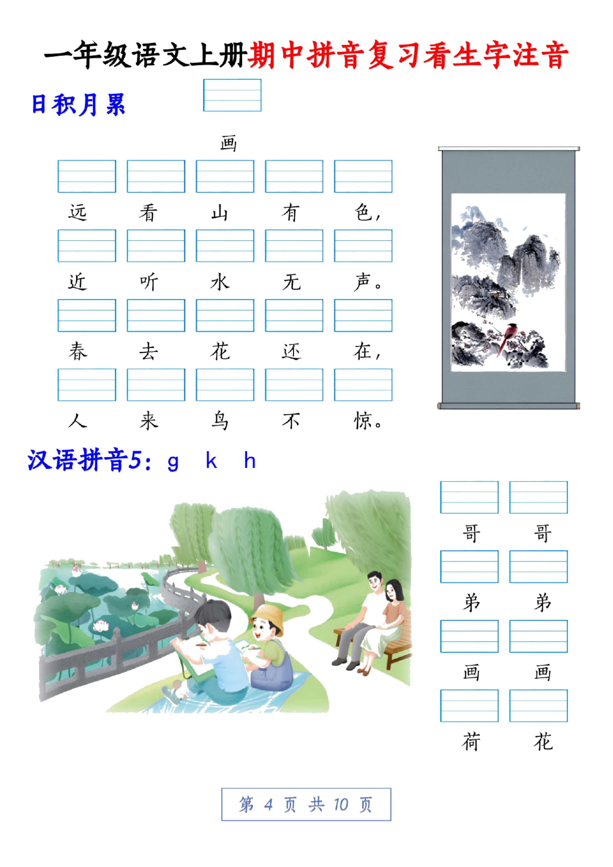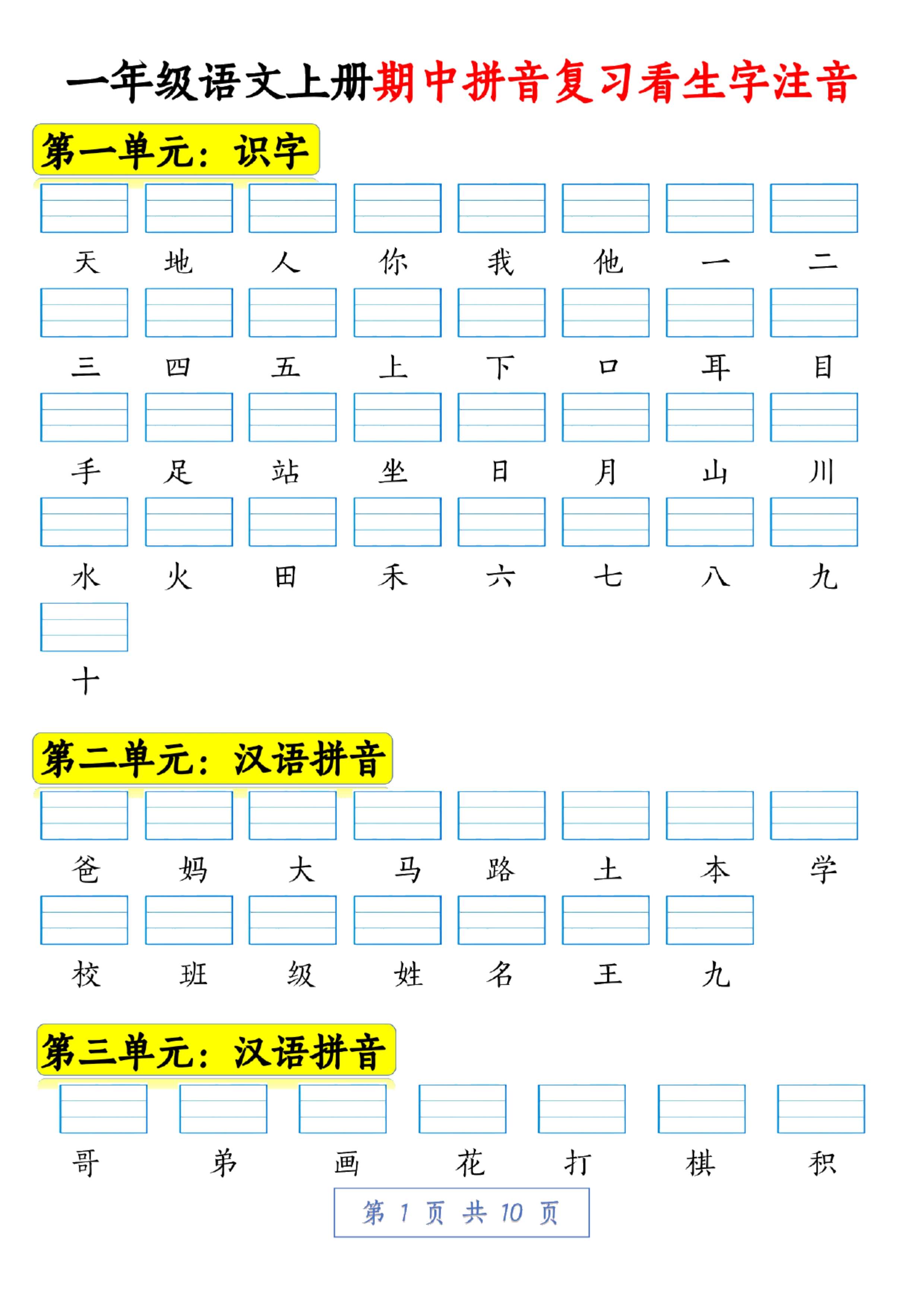 这份资料是部编版一年级语文上册的拼音复习,一共10页,全是生字注音练习,涵盖了识字、汉语拼音以及日积月累等多个方面。