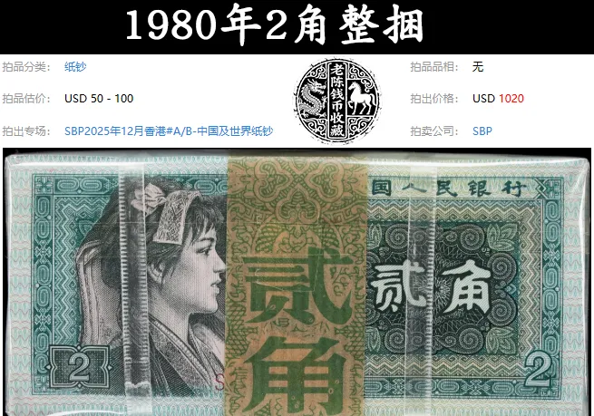 这一捆(1000张)的1980年2角纸币,就厉害了,在去年12月的时候,最终以1020美元的价格被拍出。按照汇率折算下来的话,相当于价值7102元,一张7块多了,比上面那一捆高了2倍多。