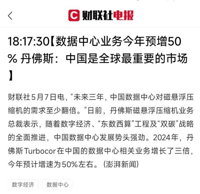 消息面上,根据财联社5月7日消息,丹佛斯磁悬浮压缩机业务总裁表示:“未来三年,中国数据中心对磁悬浮压缩机的需求至少翻倍”。他认为,随着数字经济、“东数西算”工程及“双碳”战略等全面推进,中国数据中心发展势头强劲。并且丹佛斯在中国数据中心相关业务实现了快速增长。