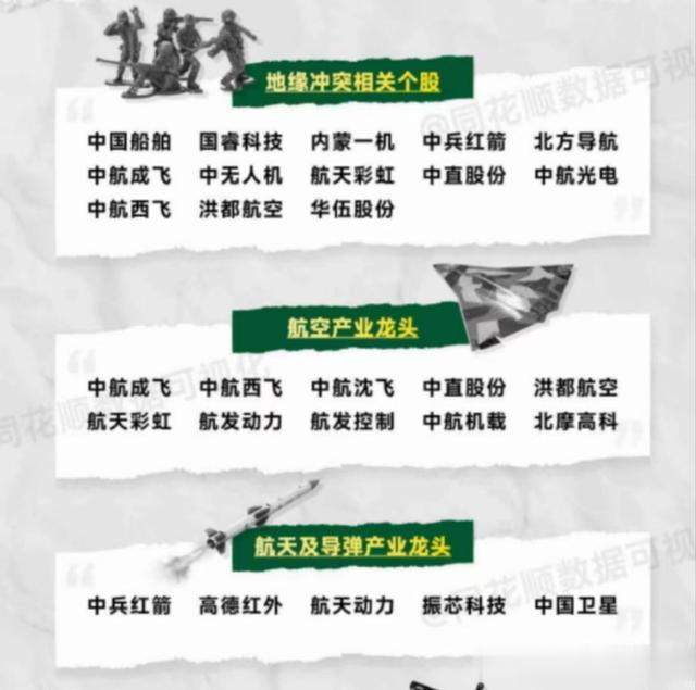 1、地缘冲突相关概念股:中国船舶、国睿科技、内蒙一机、中兵红箭、北方导航、中航成飞、中无人机、航天彩虹、中直股份、中航光电、中航西飞、洪都航空、华伍股份。