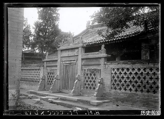 西安府某寺院的石质山门,砖雕漏墙配石狮望柱,尽显关中古建筑的精致细节。