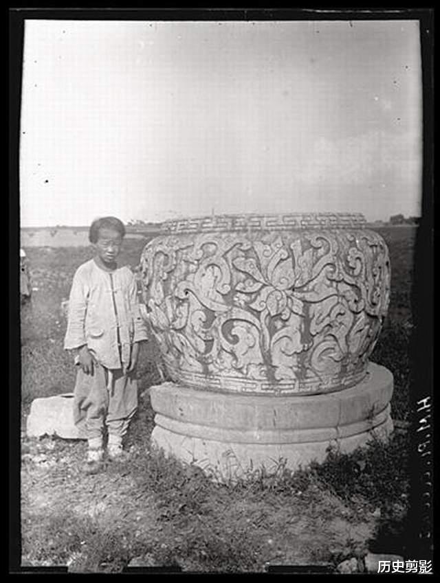 郊外的巨型石雕香炉,缠枝纹饰繁复精美,旁立的百姓更衬出这件古物的体量与工