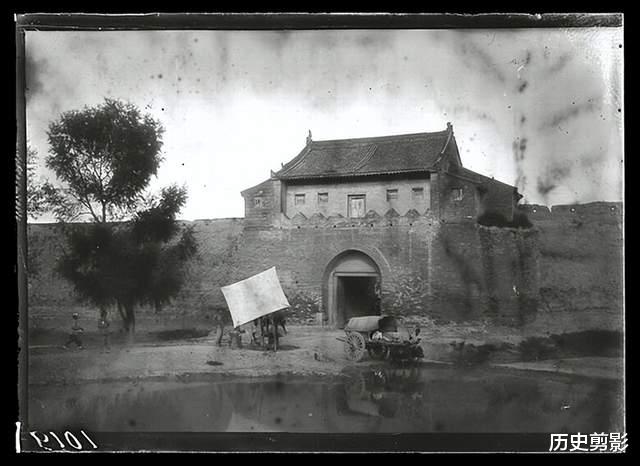 西安府城外的城门,骡车停靠在水畔,城墙门洞与民居屋顶勾勒出清末城乡交界的风貌