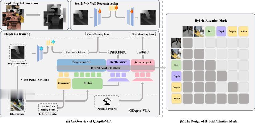 为解决深度预测辅助任务存在的监督噪声和信号冗余问题,中国科学院自动化研究所与灵宝 CASBOT 共同提出了 QDepth-VLA,通过引入量化深度预测机制与混合注意力结构,使模型在保持语义一致性的同时,获得稳健的三维空间感知与动作决策能力。整体方法包括三部分 (如图):