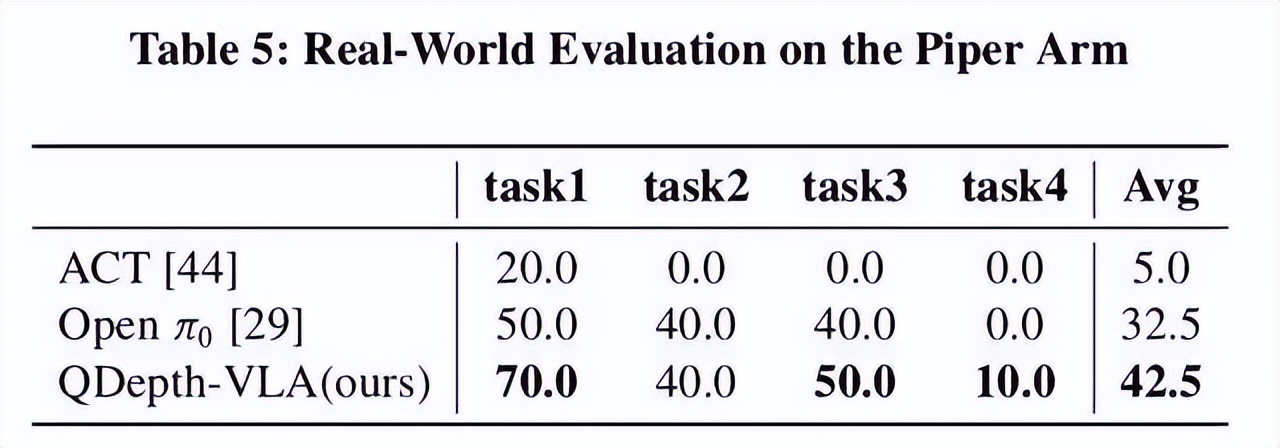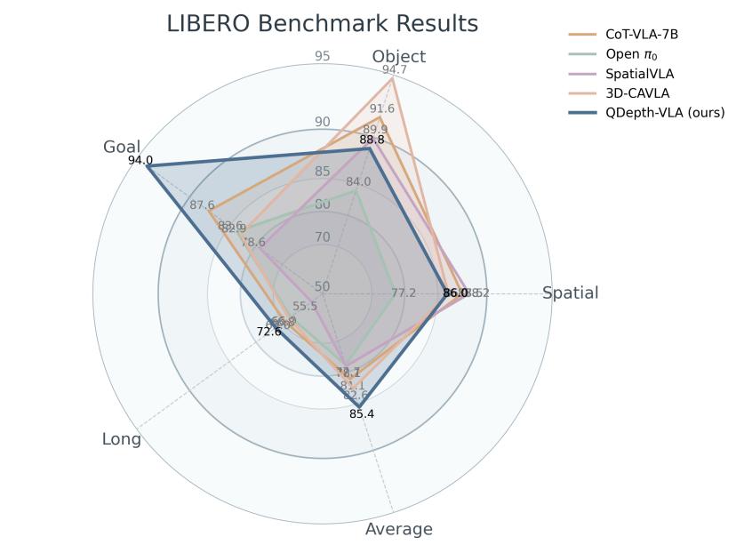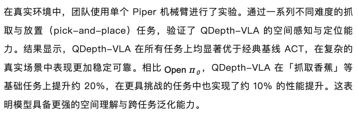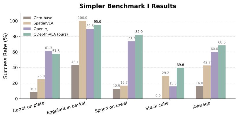 通过上述设计,QDepth-VLA 实现了视觉语义、空间几何与动作策略的协同学习,在多任务、多场景中展现出更强的泛化与稳定性。