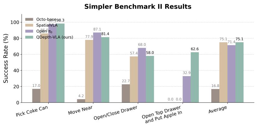 为全面评估 QDepth-VLA 的性能,团队在两个主流机器人仿真环境 (Simpler 与 LIBERO ) 与真实环境下进行了测试,涵盖多种物体抓取、空间定位与多步操作任务。结果显示,QDepth-VLA 在不同测试平台上均取得了显著提升。