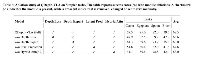 为了验证 QDepth-VLA 各组件的实际贡献,团队还在 Simpler 任务上进行了系统的消融实验。