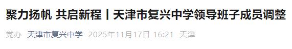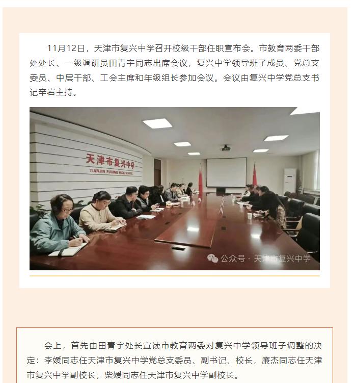 11月12日,天津市复兴中学召开校级干部任职宣布会。市教育两委干部处处长、一级调研员田青宇同志出席会议,复兴中学领导班子成员、党总支委员、中层干部、工会主席和年级组长参加会议。会议由复兴中学党总支书记辛岩主持。