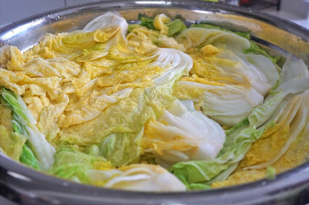 4、白菜都烫完后,找个大一点的容器。按照 1 斤白菜 20 克盐的比例,一层白菜一层盐地码放好。这里得特别注意,装白菜的容器一定要保证无水无油,最好再用白酒消毒一遍,这样更保险。