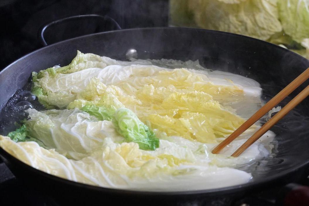 3、接着烧一锅水,等水烧开了,把白菜放进去稍微烫一下,烫软了就赶紧捞出来,整个过程大概 10 秒钟就行。