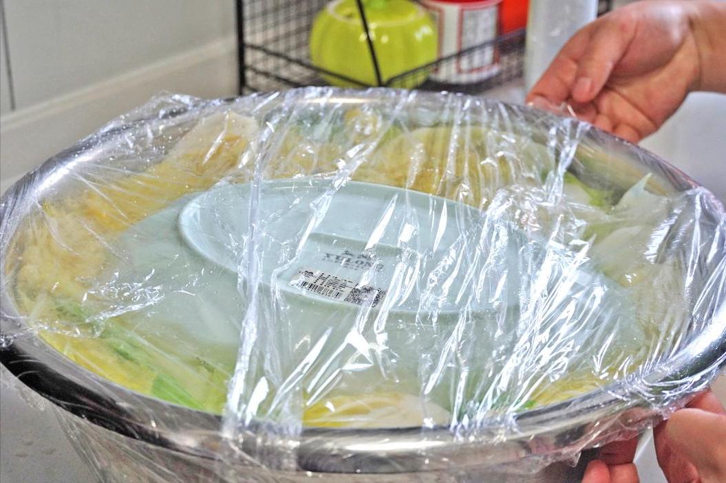 5、白菜都装好了,就往盆里倒入凉白开水,再加上 20 克白酒。这白酒的作用就是能让酸菜发酵得更好,味道更香浓。最后在最上面用个盘子盖一下。然后给盆盖上保鲜膜,再盖上盖子,找个阴凉的地方放着,大概放 1 个月左右就能吃啦。