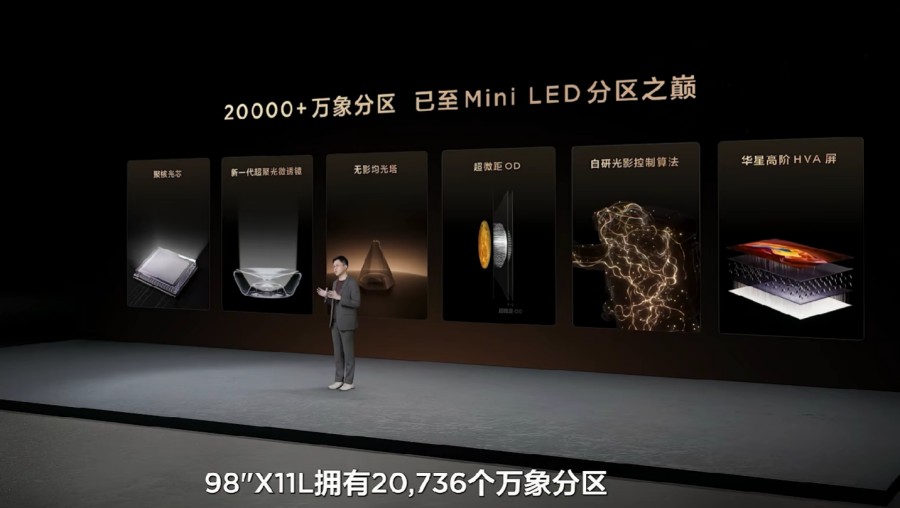 搭载该技术的X11L SQD-Mini LED电视成为全场焦点。作为技术落地的首款产品,X11L采用“一区顶多区”的万象分区系统(98英寸拥有20736个万象分区),配合超级蝶翼华曜屏(晶粹高色阻屏幕),实现了对光线的精准控制。TCL方面称,它的色彩表现打破了行业在色域方面的短板,甚至能够达成RGB-Mini LED电视也无法实现的“全局高色域”,同时机身厚度较上代产品减少。在现场展示中,X11L的动态对比度、色准及暗场细节表现均超越当前市场主流旗舰机型。值得一提的是,尽管被认为是年度机皇,但19999元的起售价诚意十足。