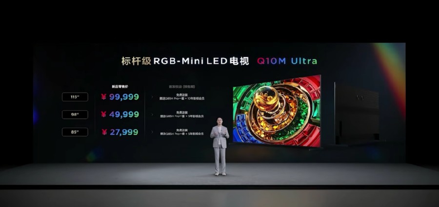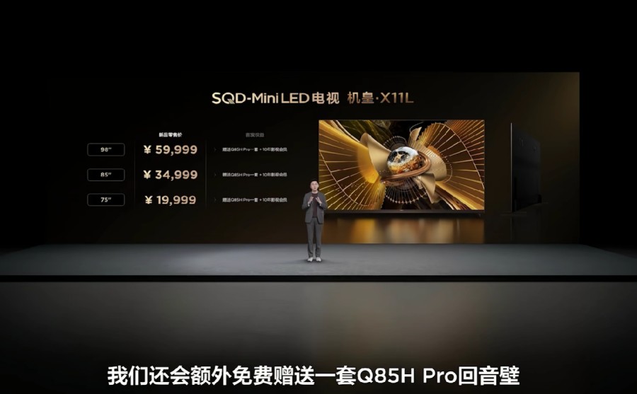 目前,X11L、Q10M Ultra及Q9M三款新品已开启预售,价格从7999元到99999元不等。其中X11L 75英寸 19999元,85英寸34999元,98英寸59999元:Q10M Ultra系列85英寸27999元,98英寸49999元,115英寸99999元;Q9M 98英寸19999元,85英寸11999元,75英寸9999元,65英寸7999元。
